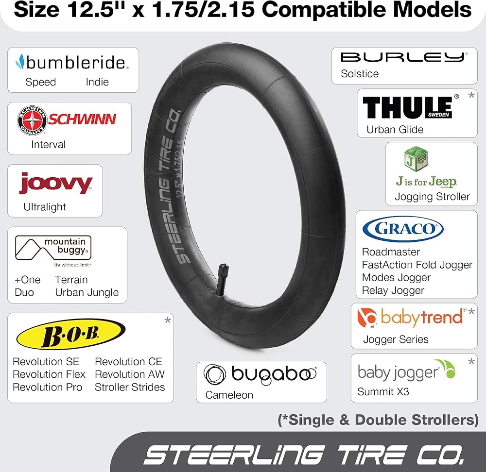 متوافقة مع أفضل العلامات التجارية لعربات الأطفال: الأنابيب الداخلية الخاصة بنا لعربات الركض عالمية لأي إطار يبلغ قطره الخارجي 16 بوصة وعرض الإطار من 1.75 إلى 2.25 بوصة. يرجى معرفة أن هذه الأنابيب الداخلية تناسب أيضًا العلامات التجارية مثل BOB Gear Revolution وAlterrain & Stroller Strides وMountain Buggy Terrain وBaby Jogger وBurley Solstice وThule Urban Glide وGraco Roadmaster/FastAction Fold/Modes/Relay والمزيد.