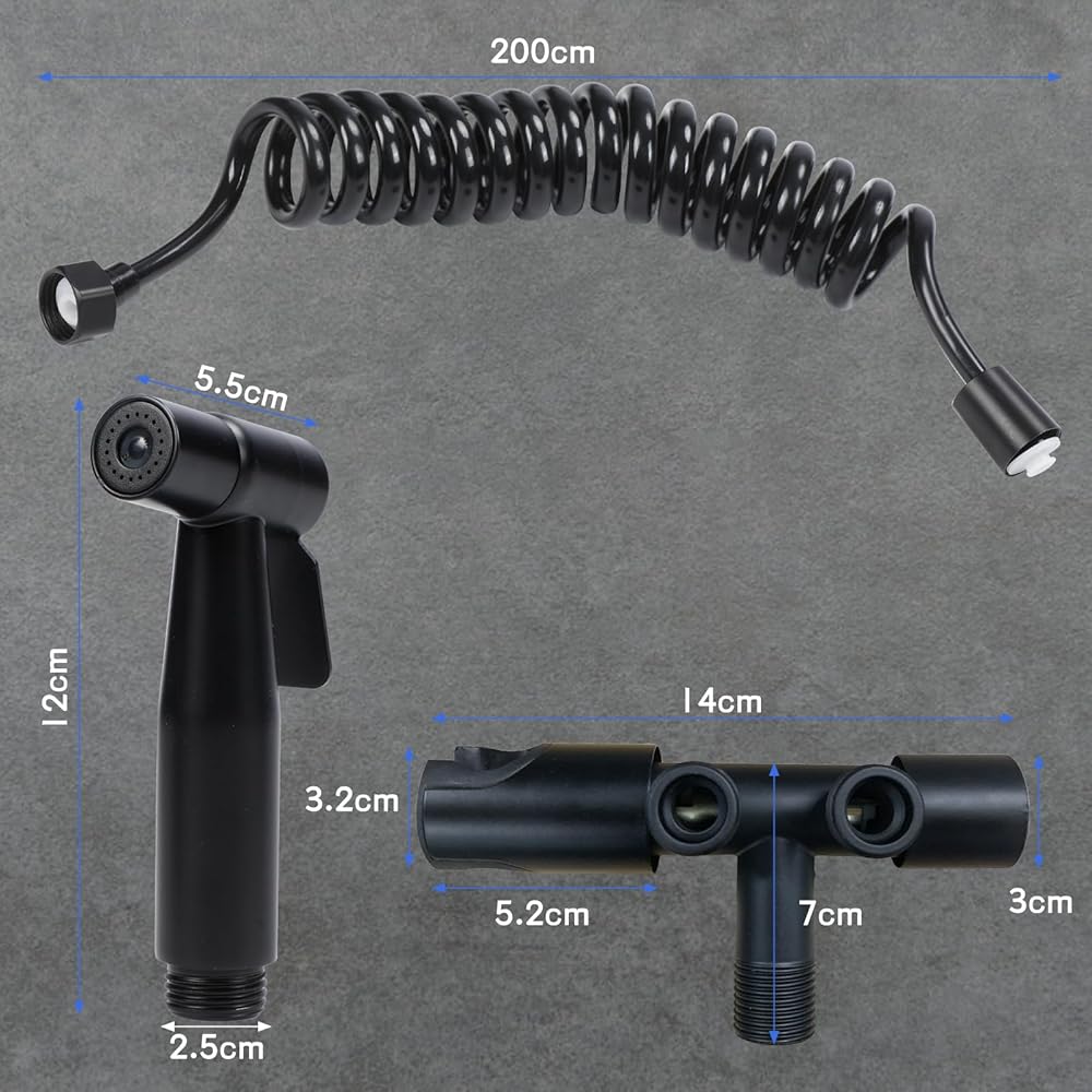 [التحكم في تدفق المياه] يمكن للبخاخ الأسود المحمول على الحائط التحكم في ضغط الماء من أجل تنظيف لطيف وشامل. في وضع الرش النفاث، سوف تحصل على تيار ماء قوي سيكون رائعًا لتنظيف المرحاض أو القصرية أيضًا! التفريغ، وتصريف المياه على نحو سلس وقوة التنظيف القوية. مجهزة بأنبوب تلسكوبي يمكن تمديده حتى 2 متر.