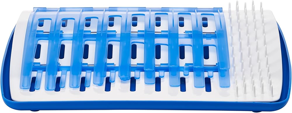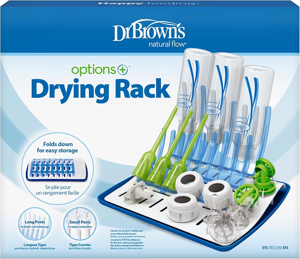 Set it up, load it up, and fold it up! The Dr. Brown's Folding Baby Bottle Drying Rack is there when you need it and gone when you don't. Save time and counter space when cleaning your Dr. Brown's bottles and accessories with this baby essential. The raised drying platform with water collection tray keeps your counters dry and holds up to 10 Dr. Brown's Narrow or 8 Dr. Brown's Wide-Neck bottles – and most other brands, too. The universal design fits cups, bowls, pacifiers, teethers, and so much more! When you need the counter space, just fold it up and put it away. The drying rack is dishwasher (top rack) safe so cleaning it is a breeze.