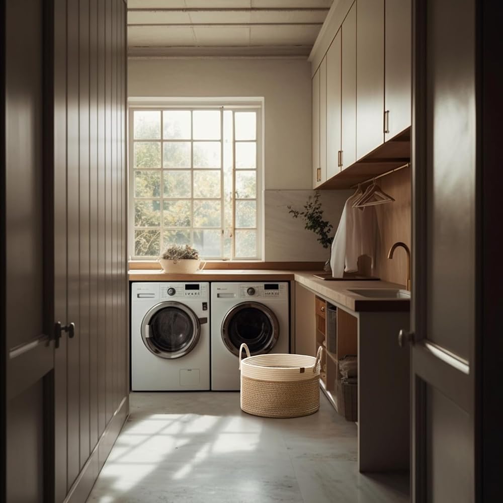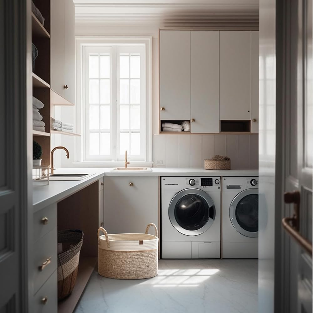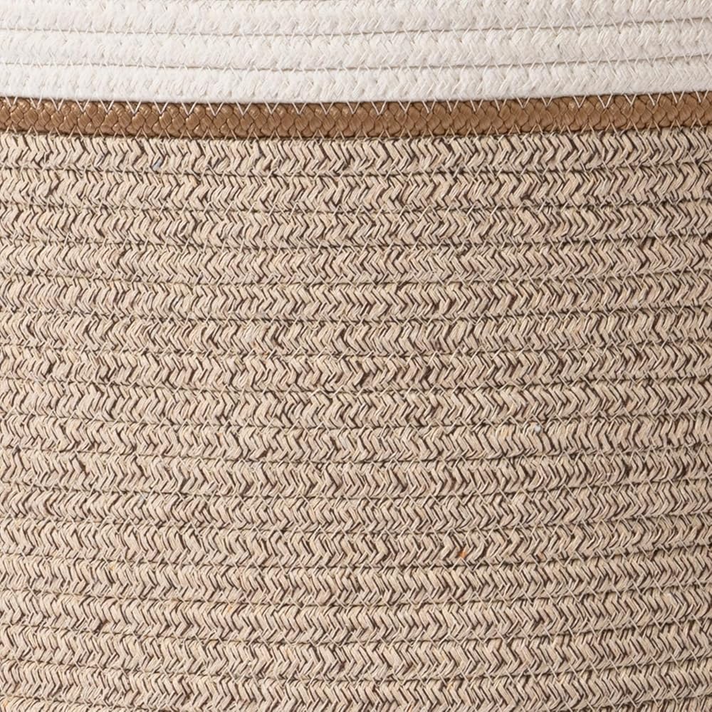 سلة غسيل ذات سعة كبيرة - مقاس 16 بوصة ارتفاع × 14 بوصة عرض × 14 بوصة طول يوفر مساحة تخزين واسعة لألعاب أطفالك والبياضات الإضافية والمناشف وغسيل الملابس العائلية. بفضل المقبضين المتينين، من السهل حمل سلة الغسيل المصنوعة من الحبال القطنية في جميع أنحاء المنزل.