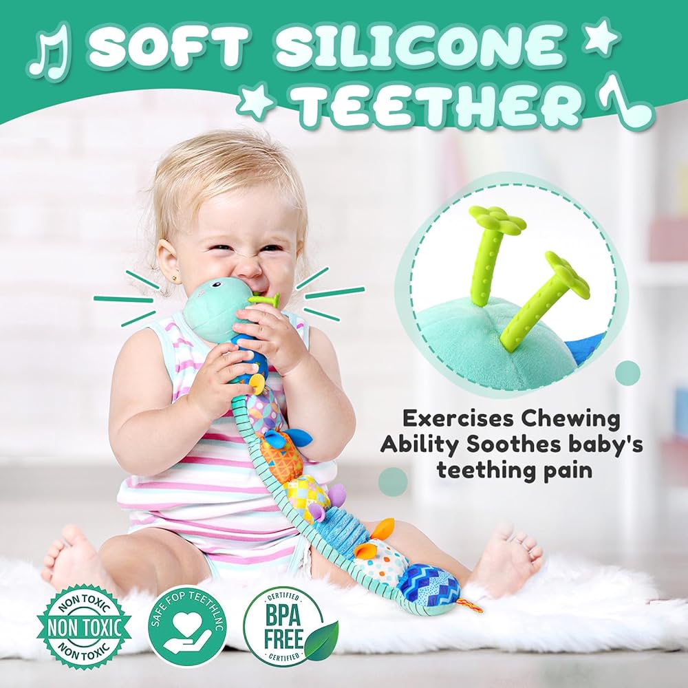 Covered in captivating colors, patterns and textures from head to tail to inspire kids to play, rock and cuddle.