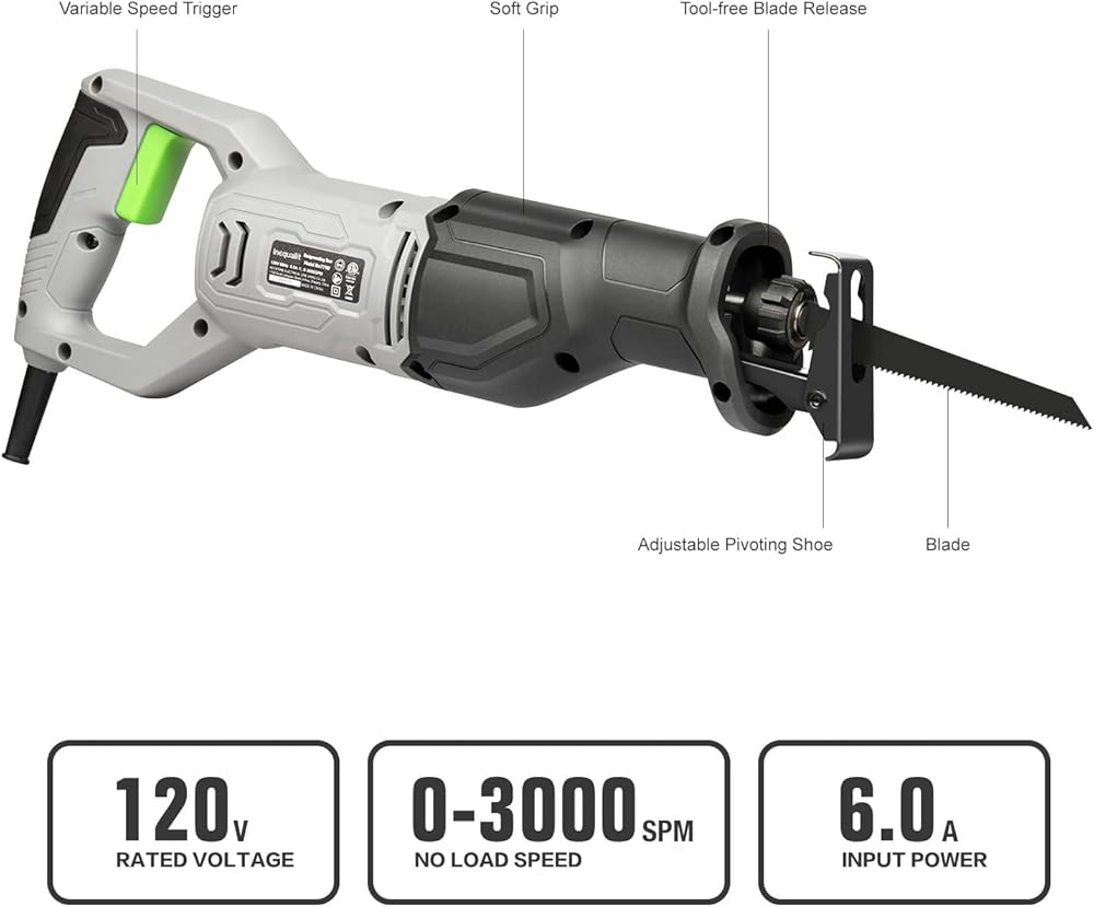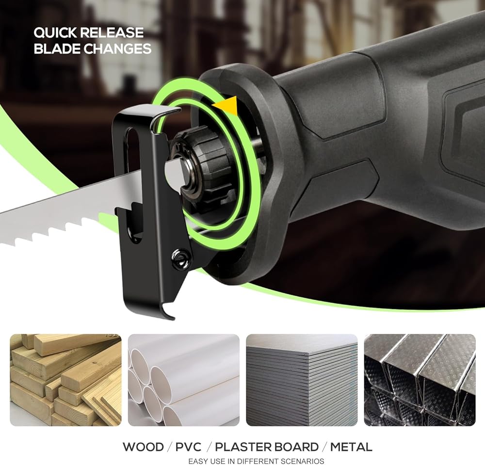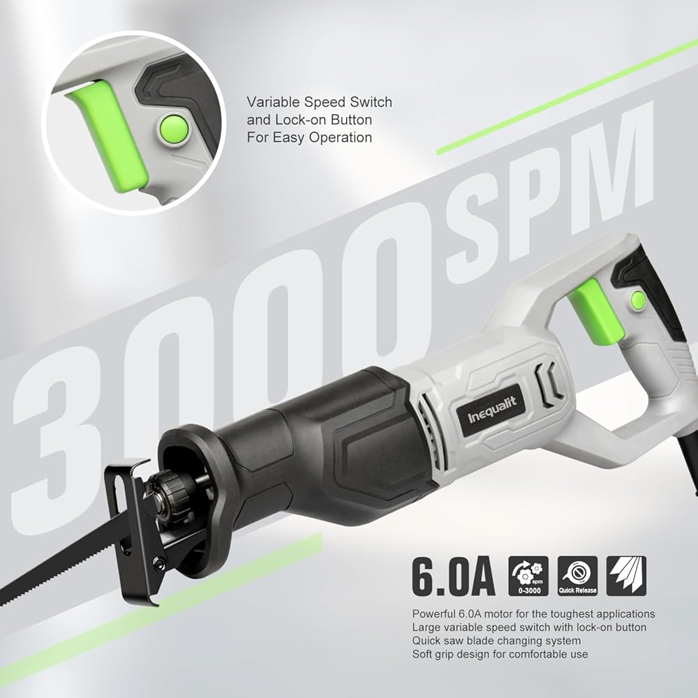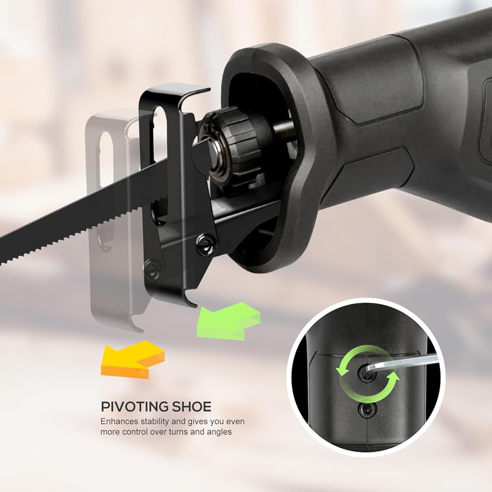 مُحسَّن لتعدد الاستخدامات: يتميز هذا المنشار الترددي بطول شوط يبلغ 4/5 بوصة، ويحقق أقصى عمق قطع يبلغ 4-1/2 بوصة في الخشب. يحافظ زر القفل المريح على سرعة القطع، مما يحرر الإصبع من ضغط الزناد المستمر