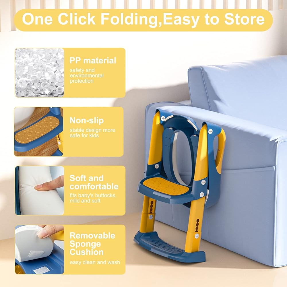 متوافقة مع معظم المراحيض: مقاعد المراحيض مناسبة للمراحيض على شكل حرف V وعلى شكل حرف U وعلى شكل O. التصميم القابل للطي يجعل نونية التدريب سهلة الحركة، لذلك يمكنك وضع مقعد المرحاض جانبًا عندما لا تحتاج إليه.