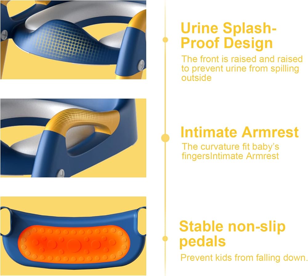 تصميم ثابت ومريح: يتميز مرحاض التدريب على استخدام المرحاض الخاص بنا بتصميم مسند ظهر لحماية العمود الفقري لطفلك. تصميم مضاد لرذاذ البول يمنع الطفل من التبول.