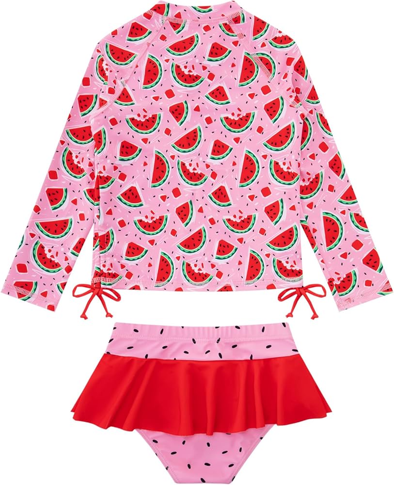 ميزات التصميم - بدلة سباحة للفتيات الصغيرات مكونة من قطعتين، قميص سباحة طويل الأكمام بسحاب، أربطة قابلة للتعديل على كلا الجانبين، سهل الارتداء؛ جزء سفلي مرن مع تفاصيل مكشكشة، مجموعة حماية من الطفح الجلدي الرائعة للفتيات الصغيرات.