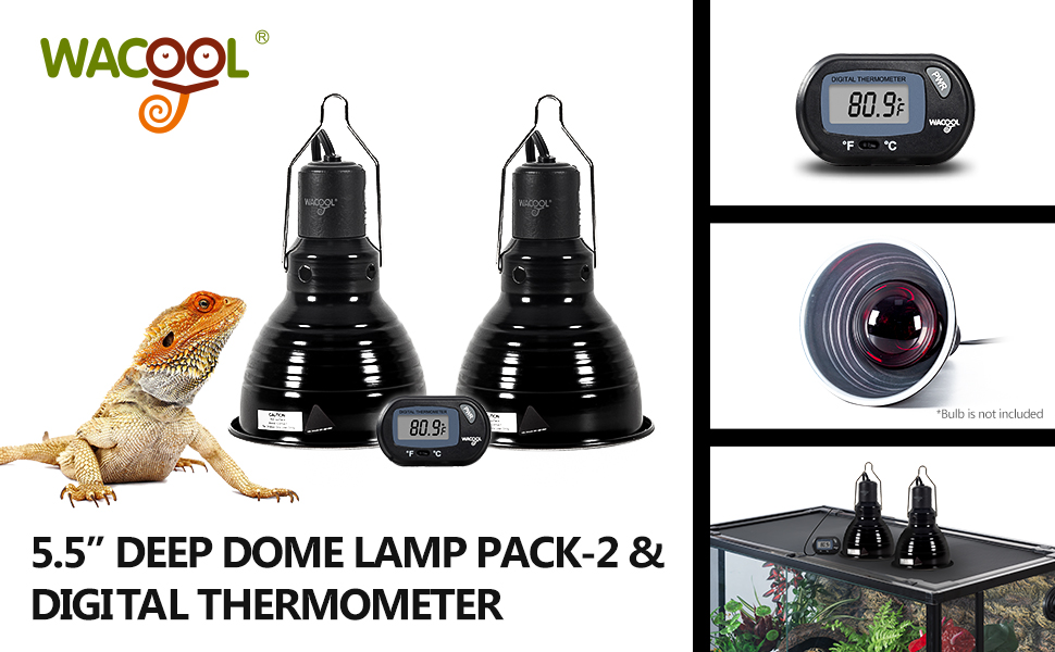 • تشتمل العبوة على قطعتين من مصابيح الزواحف مقاس 5.5 بوصة ومقياس حرارة رقمي قطعة واحدة، وهي متوافقة تمامًا مع مصابيح الزواحف.