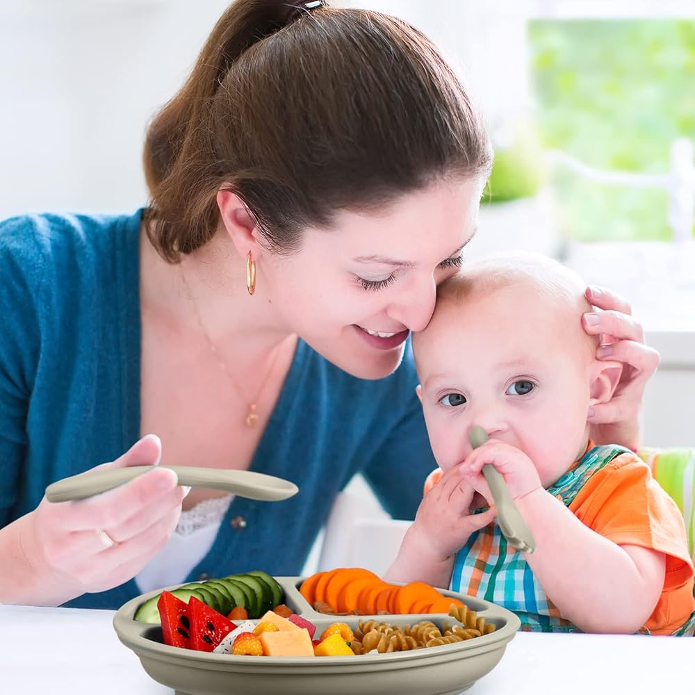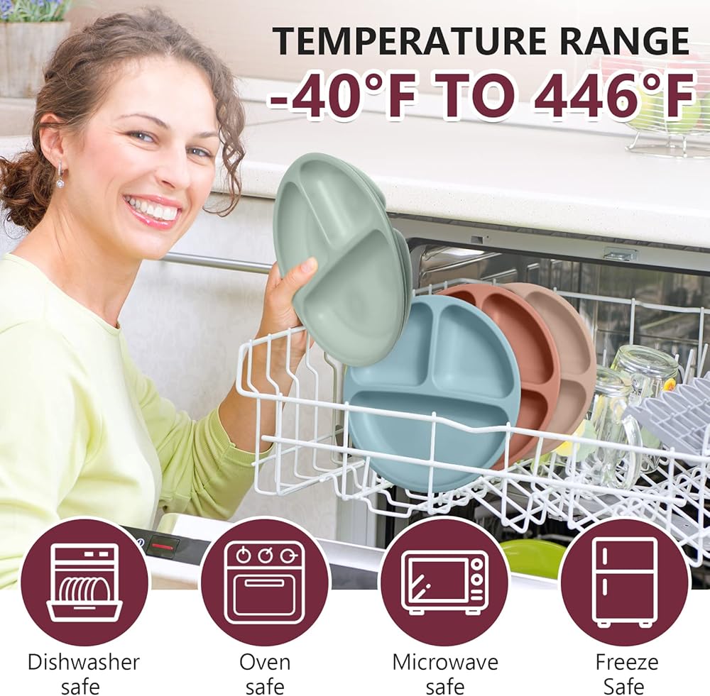 The silicon baby plate, toddler forks and spoons can be quickly rinsed or put in the dishwasher, and they do not absorb the color or smell of food, making cleaning work easier.