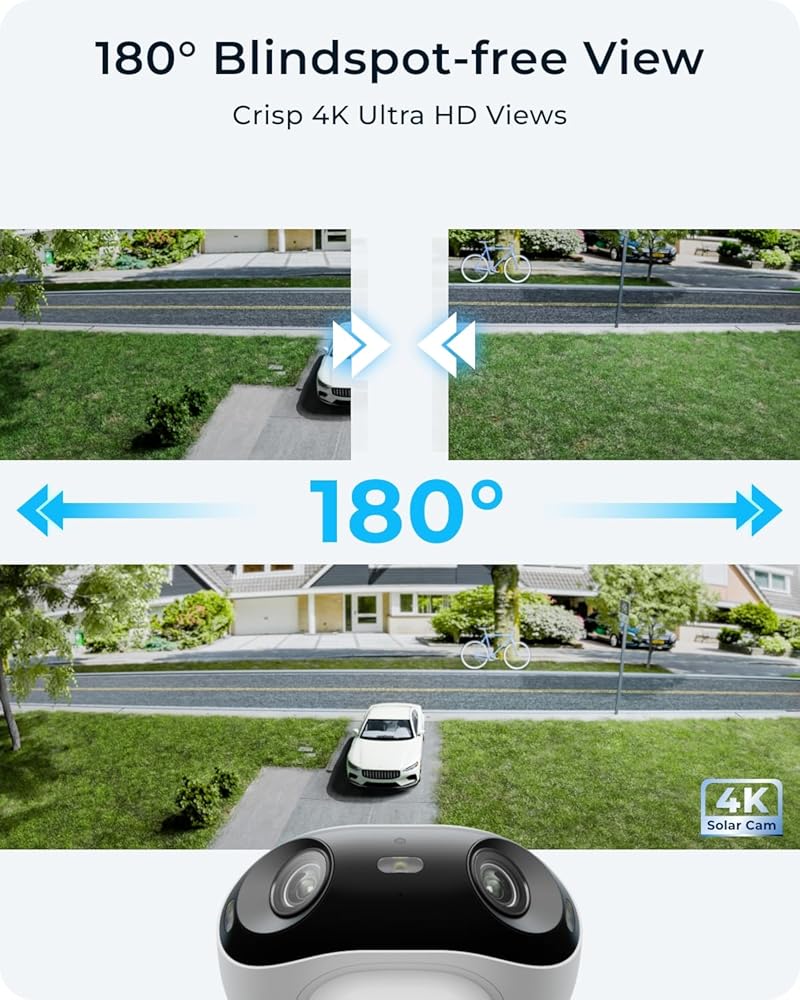 كاميرات REOLINK 4K الشمسية الأمنية اللاسلكية في الهواء الطلق، رؤية خالية من النقاط العمياء 180 درجة، رؤية ليلية ملونة الأضواء، شبكة Wi-Fi 6 ثنائية النطاق، اكتشاف الذكاء الاصطناعي الذكي، بدون رسوم إضافية، لوحة شمسية Argus 4+ 6W