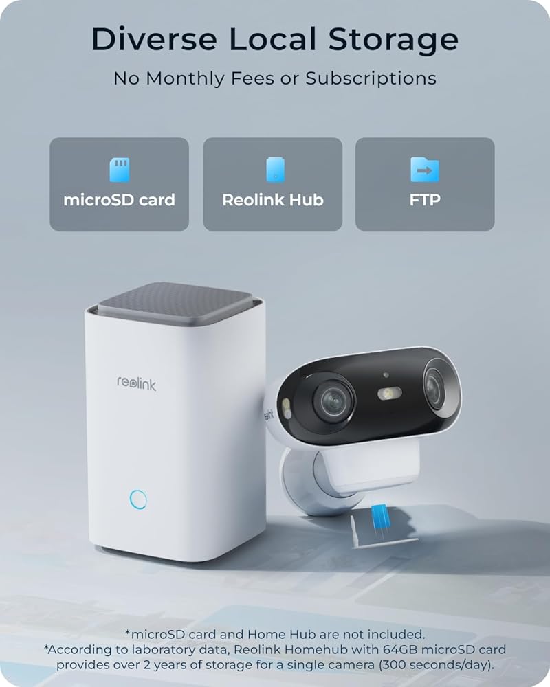 [تخزين محلي متنوع] يدعم خيارات تخزين محلية متعددة: بطاقات microSD (حتى 128 جيجابايت، غير متضمنة)، خوادم FTP، Reolink Home Hub