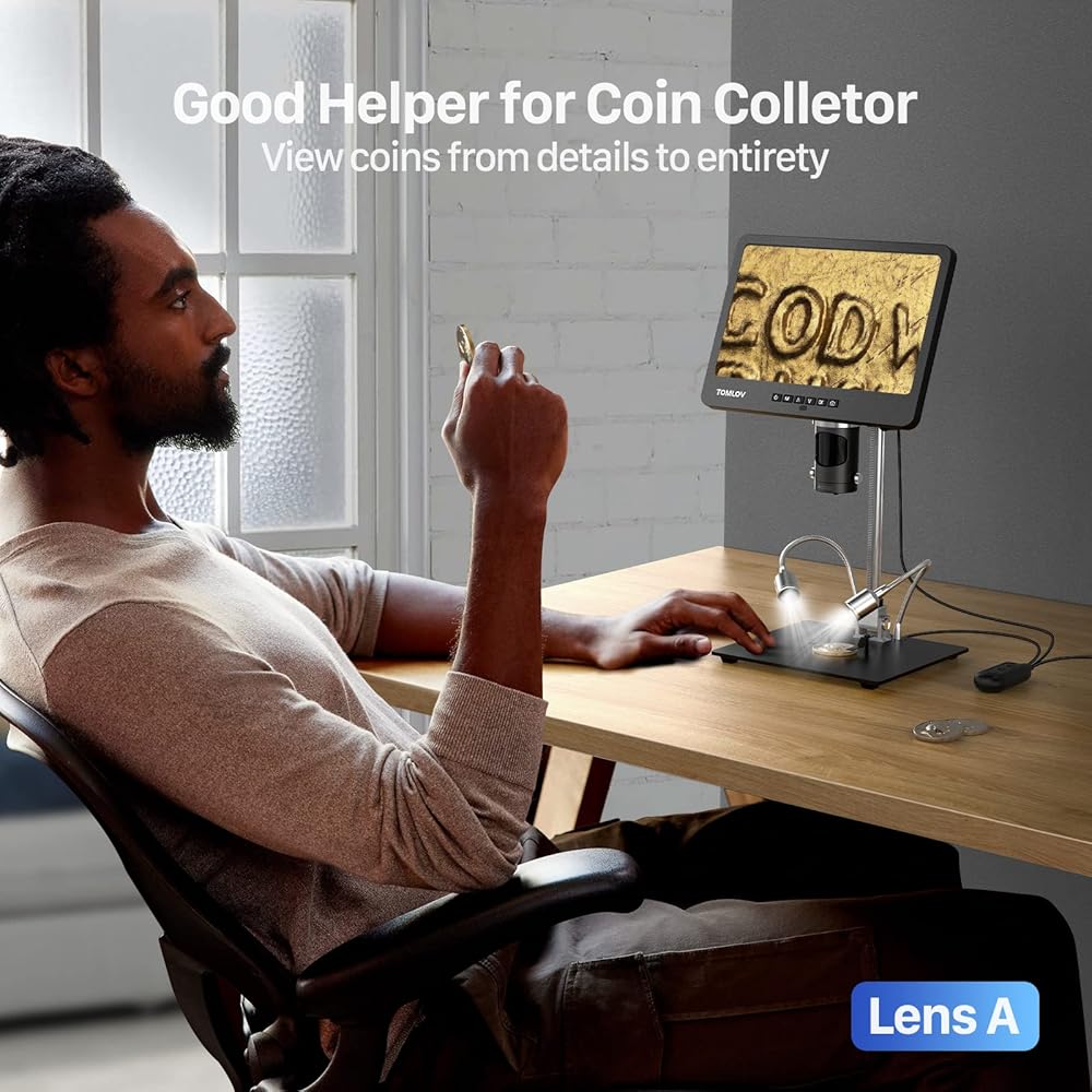 عدسة العملات المعدنية الأساسية A لفحص العملات المعدنية من التفاصيل إلى العرض الكامل: يتميز مجهر العملات المعدنية مقاس 10.1 بوصة بحامل أطول، ويلتقط التفاصيل الكاملة للعملات المعدنية، بدءًا من الدايمات وحتى الدولارات الفضية الكبيرة، مما يجعله مثاليًا لفحص العملات المعدنية الخاطئة مع مناظر واضحة وكاملة