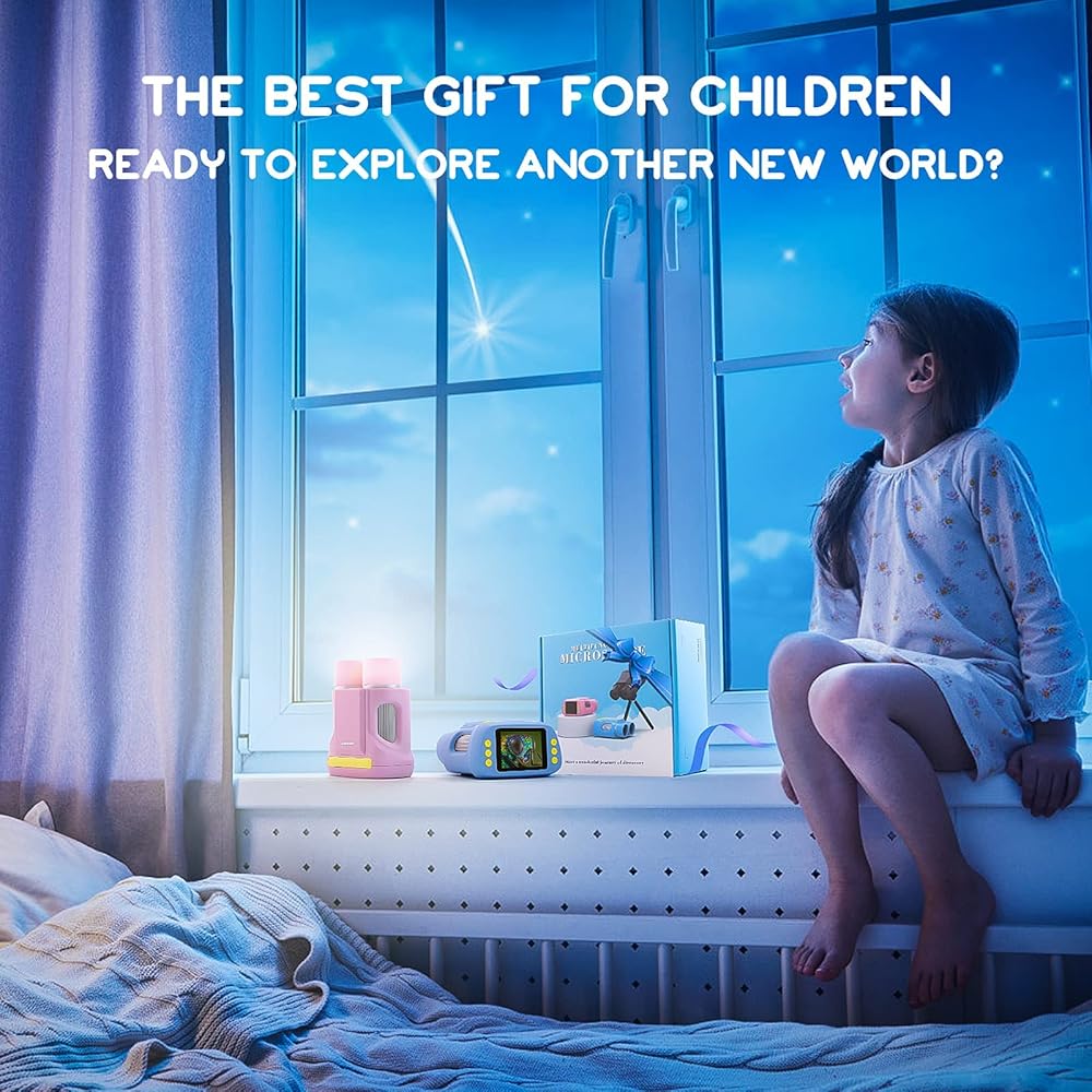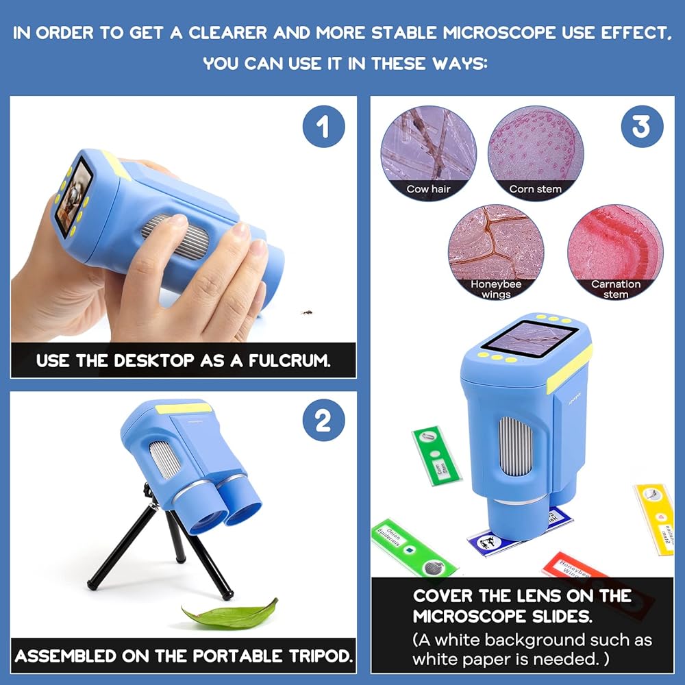 【دقة عالية وتكبير】جودة صورة 1080FHD، تكبير أكبر 200 مرة مع 8 مصابيح LED مدمجة قابلة للتعديل لكل عدسة، والتي يمكن أن توفر تكبيرًا كافيًا وتلبي احتياجات الأطفال بما فيه الكفاية.