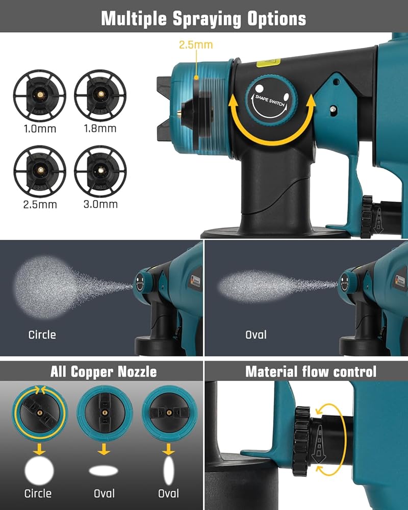 【خيارات رش متعددة】- ثلاثة أنماط رش مميزة (أفقي ورأسي ودائري) وأربعة أحجام للفوهات النحاسية (1.0 مم، 1.8 مم، 2.5 مم، و3.0 مم) لتناسب مشاريع الطلاء المختلفة. مقبض التحكم في التدفق في الخلف يتيح لك الزناد ضبط معدل التدفق للسوائل المختلفة بسهولة.