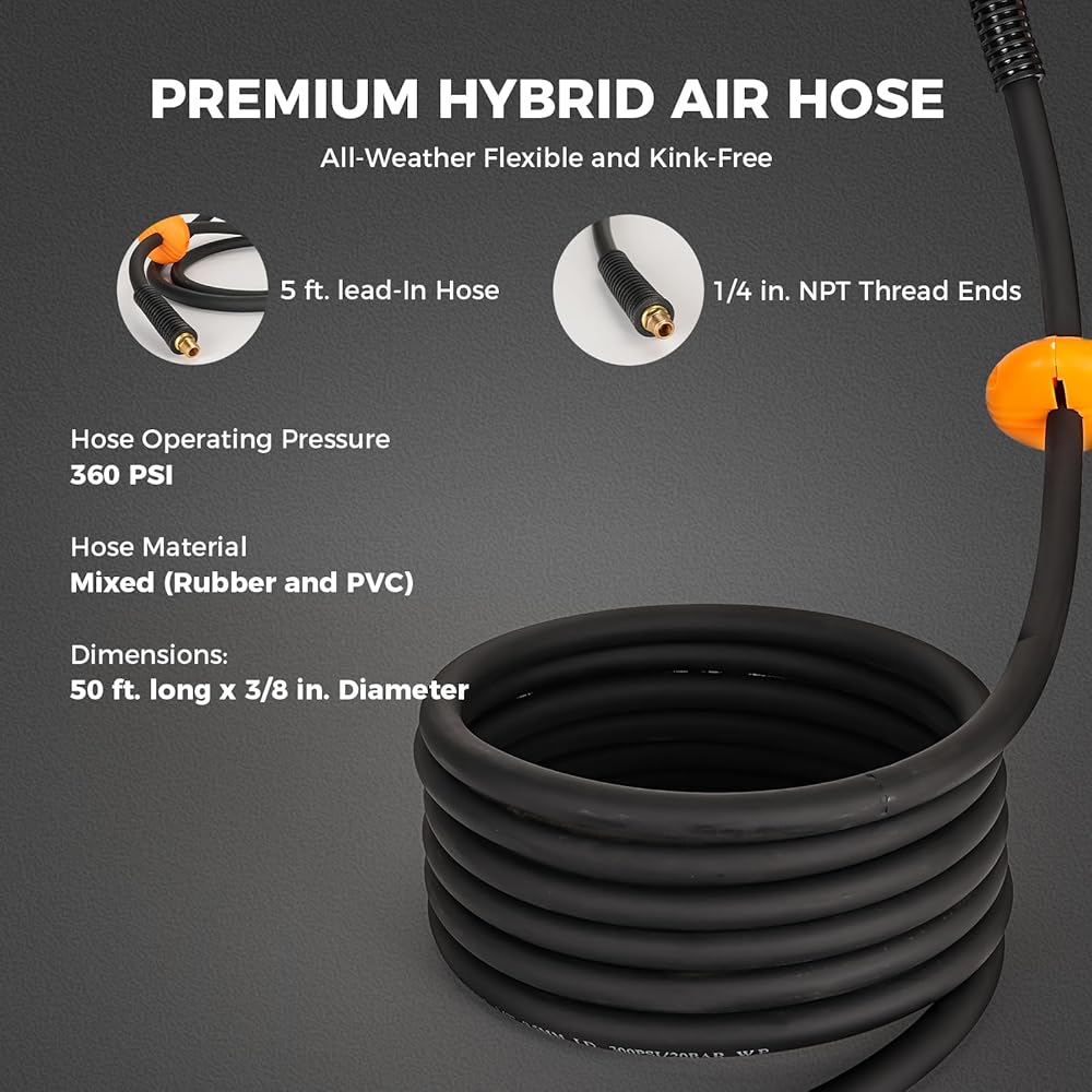 【خرطوم مرن وسلسلة تمديد بطول 6 أقدام】: يحافظ خرطوم البوليمر الهجين عالي الجودة على المرونة في جميع الأحوال الجوية ويأتي في متناول اليد كل شتاء (-13 إلى 113 درجة فهرنهايت). يمكن للخرطوم المزدوج الجدار مقاس 0.22 بوصة أن يتحمل ضغطًا يصل إلى 360 رطل لكل بوصة مربعة، لذلك لن ينثني أو يتسطح أو يتوسع أو ينفجر تحت الضغط. القطر الداخلي لخرطوم الهواء القابل للسحب هو 3/8 بوصة (المنتجات المماثلة 0.35 بوصة)، مما يزيد من تدفق الهواء بنسبة 5%.
