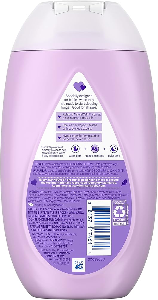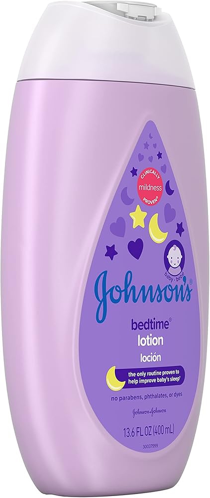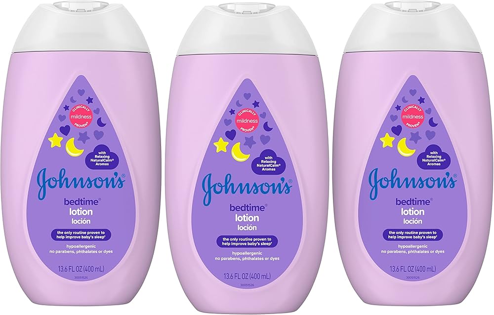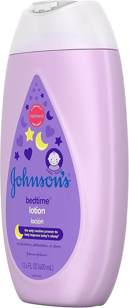 Gently nourish and moisturize your baby's delicate skin with Johnson's Mild Moisturizing Bedtime Baby Lotion with a new formula. This soothing baby lotion is formulated with the naturally derived ingredient coconut oil that nourishes skin to leave it feeling touchably soft and smooth. This hypoallergenic nighttime baby lotion is enhanced with calming and relaxing NaturalCalm aromas to help soothe baby before bed. This nourishing baby lotion is dermatologist- and pediatrician-tested, 100% gentle and free of dyes, parabens and phthalates. It is formulated to be gentle, never harsh on baby's delicate skin, leaving it feeling soft and smooth. Use Johnson's Bedtime Lotion in the evening as part of Johnson's clinically proven bedtime routine of warm bath, gentle massage, and quiet time. Routine developed and tested with baby sleep experts, this 3-step routine is clinically proven to help your baby fall asleep faster and stay asleep longer.