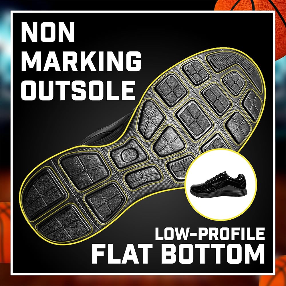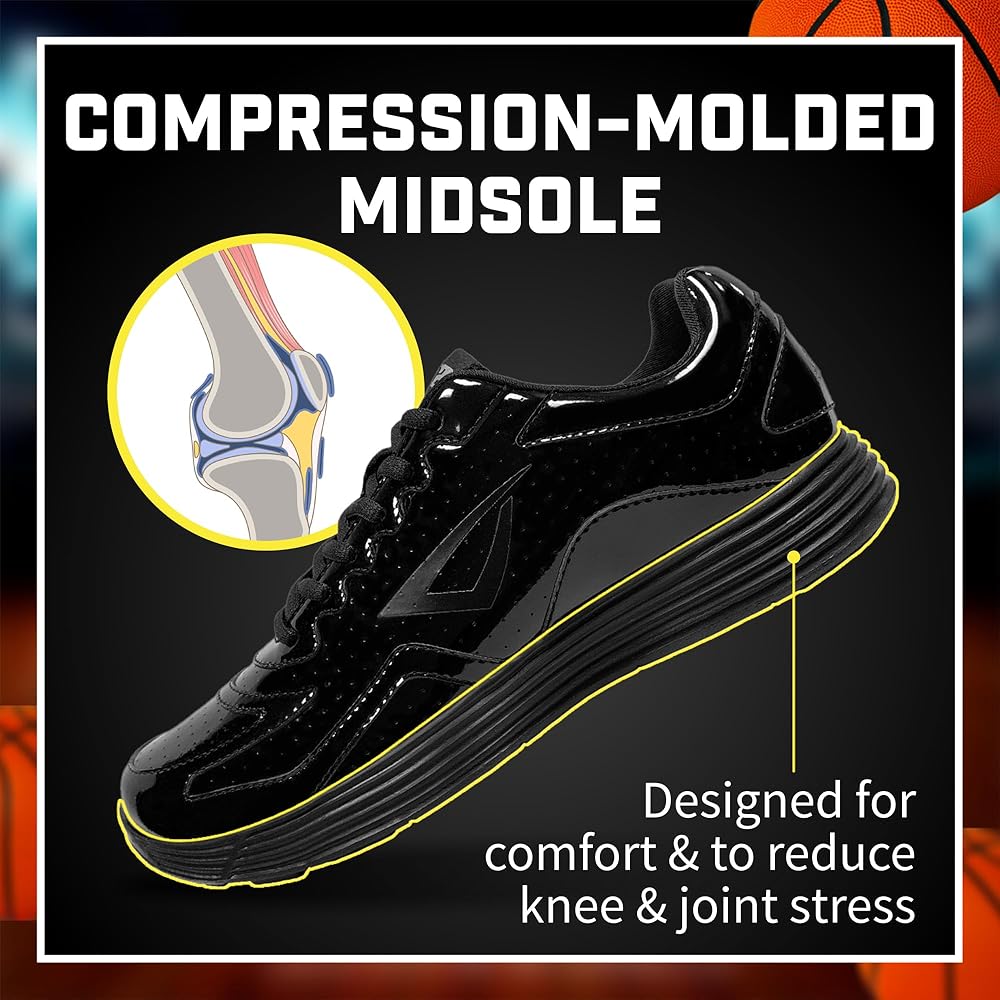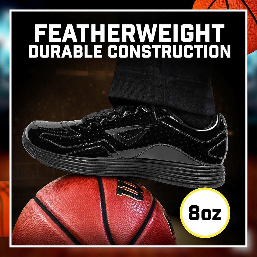 Reaction VX1 Referee Shoes ("REF VX1") DESCRIPTION: Introducing the next generation of high-performance mens referee shoes: The Reaction Referee VX1 or "REF VX1." At only 8 ounces, this revolutionary officiating shoe is both feather weight and features a wear-resistant, easily polished 100% ventilated patent leather construction that makes it a winning call for the volleyball or basketball ref with an eye on comfort and durability. Lightweight and Comfortable The REF VX1's lightweight, compression-molded EVA midsole has been specifically designed to reduce the knee and joint stress associated with prolonged standing and running. The low-profile, flat bottom, non-marking outsole is purpose built for indoor sports, and its memory foam insole and midsole keep referees stay on top of the game when gliding back and forth on the basketball or volleyball court. Tough as Nails Beyond its unrivalled comfort, this is a referee shoe that truly stands in a class of its own when it comes to durability. In surface peeling and tear strength testing, its revolutionary Micro Fabric genuine leather upper far outlasts competing brands. It also tops the charts in flex resistance which allows for fluid movement with no ill effects or discomfort for the feet. Simply put? If you're looking for the best referee shoes on the market, look no further. Grab your whistle, throw on the stripes, lace up a pair of REF VX1's and you're ready for game time. Product Details: A high-performance men's volleyball or basketball ref shoe with non-marking outsole that's perfect for calling indoor sports Wear resistant genuine patent leather officiating shoes designed for comfort and durability Easily polished leather upper to keep you looking sharp Features lightweight, compression-molded EVA midsole to keep your feet comfortable while reducing knee and joint stress Traditional black on black referee color scheme for the style to match the stripes If you have a wide foot you should consider purchasing a 1/2 size larger than you typically wear