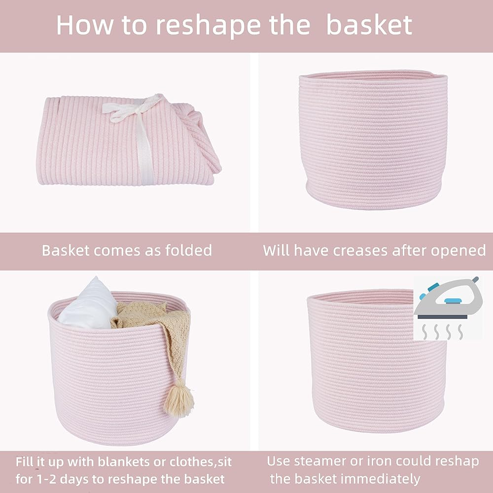ملاحظة: تأتي سلة الحضانة مطوية وقد تحتوي على تجاعيد. إن ملء سلة غسيل الطفل بالكامل بالبطانيات أو المناشف أو الملابس والانتظار لمدة 2-3 أيام سيساعد في إعادة تشكيل شكلها. يمكن أن يؤدي استخدام الباخرة أو الكي أيضًا إلى إعادة تشكيل سلة تخزين الحضانة المصنوعة من الحبال. سلة الحبال الكبيرة قابلة للغسل في الغسالة. في حالة غسله في الغسالة، يرجى وضعه في كيس غسيل للملابس الرقيقة وتجفيفه بالهواء.