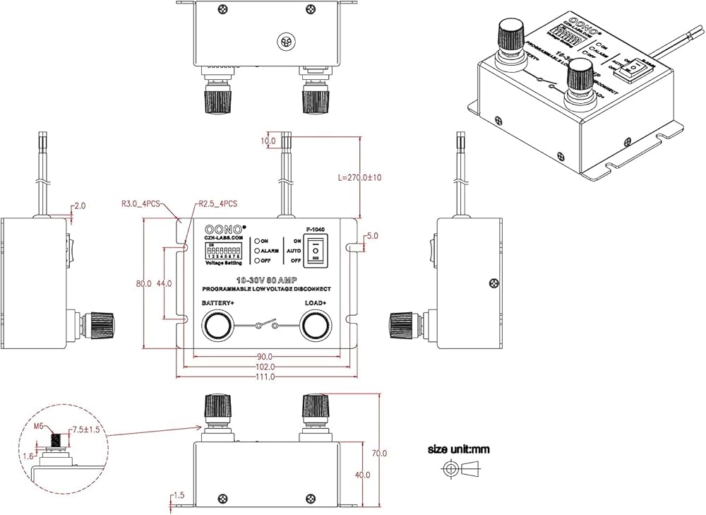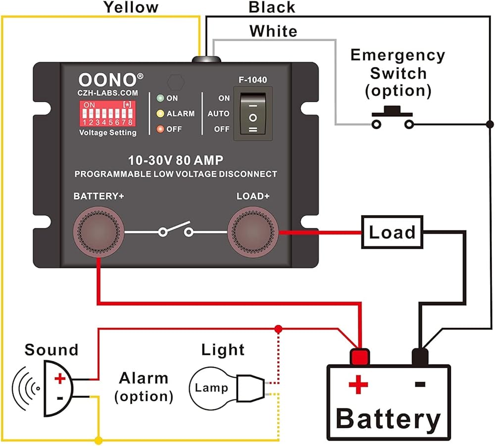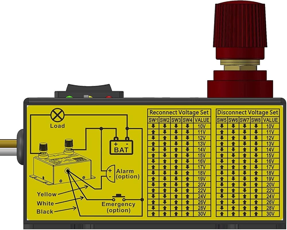 2, With a rocker switch for override, can set to ON / AUTO / OFF function. Red DIP switch, programmable voltage setting for Disconnect and Reconnect. With three mode output status led, ON / ALARM / OFF, to help you intuitively understand the output status.