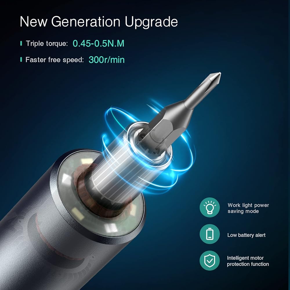 🛠️مفك براغي كهربائي عالي الكفاءة: تأتي مجموعة مفك البراغي الكهربائية بمقبض كهربائي والحد الأقصى لعزم الدوران هو 0.45-0.5/نيوتن متر، وسرعة الخمول هي 300 دورة/دقيقة، مما يمكن أن يحسن كفاءة العمل ويوفر وقتك.