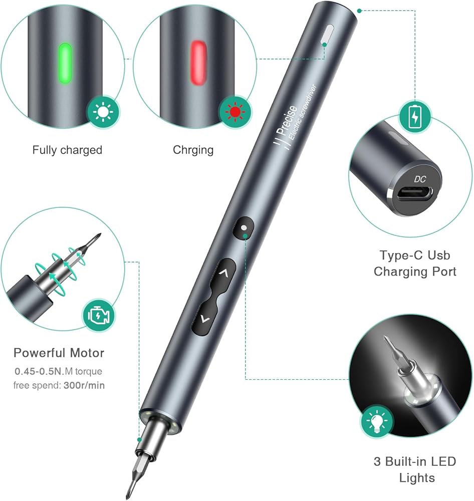 🛠️مؤشر الشحن والشحن عبر USB: عندما تضغط للأمام/للخلف، لا يعمل مفك البراغي، ويومض الضوء 5 مرات، وهو تذكير بأن مفك البراغي يحتاج إلى الشحن. ومع موجه الشحن، يتغير ضوء الشحن من الأبيض إلى الأحمر عند الشحن، ويكون الضوء الأخضر دائمًا قيد التشغيل عند الشحن بالكامل.