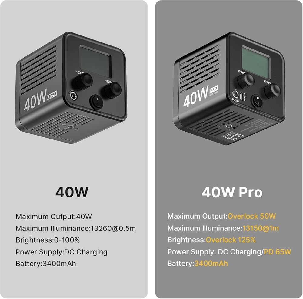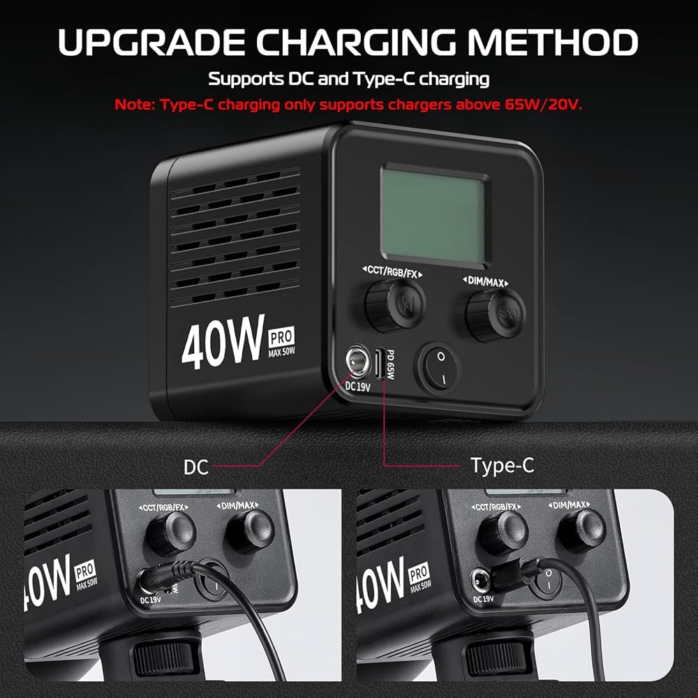 • 【تم ترقيته حديثًا بقدرة 40 وات احترافية】مصباح فيديو LED المطور مع منفذ شحن جديد من النوع C، والذي يمكن توصيله ببنك طاقة خارجي ويمكن شحنه بالكامل خلال 3 ساعات. (يدعم فقط أجهزة الشحن من النوع C التي تزيد عن 65 وات/20 فولت)