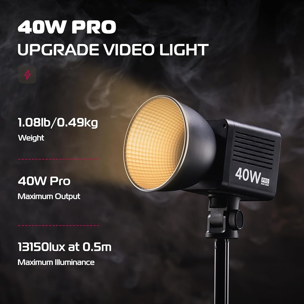 ULANZI 40W Pro مصباح فيديو LED محمول مع بطارية مدمجة 3400 مللي أمبير في الساعة، معدن صغير مزدوج درجة الحرارة COB إضاءة الإخراج المستمر مصباح كشاف محمول 2500K-6500K للفيديو