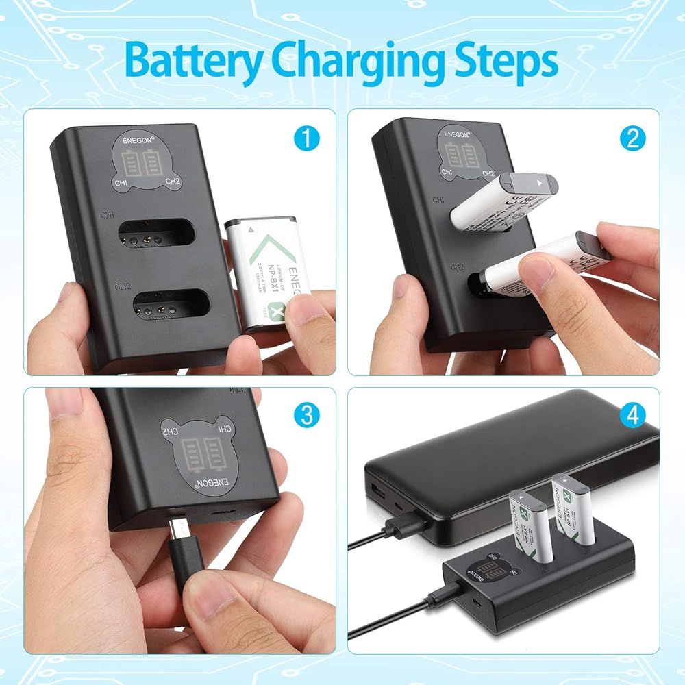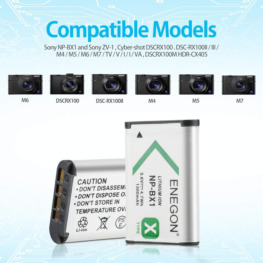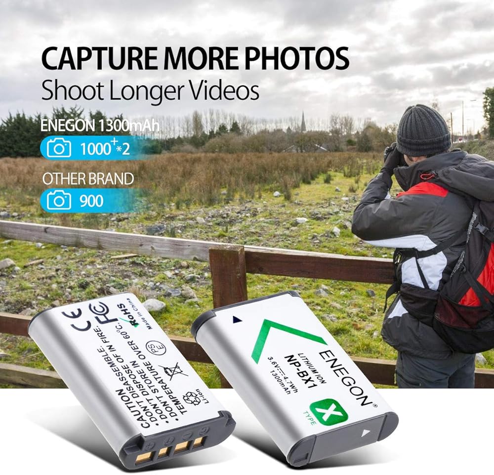 🔋 بطاريات عالية الأداء: بطاريتان ليثيوم أيون بقدرة 3.7 فولت و1300 مللي أمبير في الساعة تتوافقان مع أداء بطاريات سوني NP-BX1 الأصلية، مما يضمن تجارب تصوير طويلة الأمد.