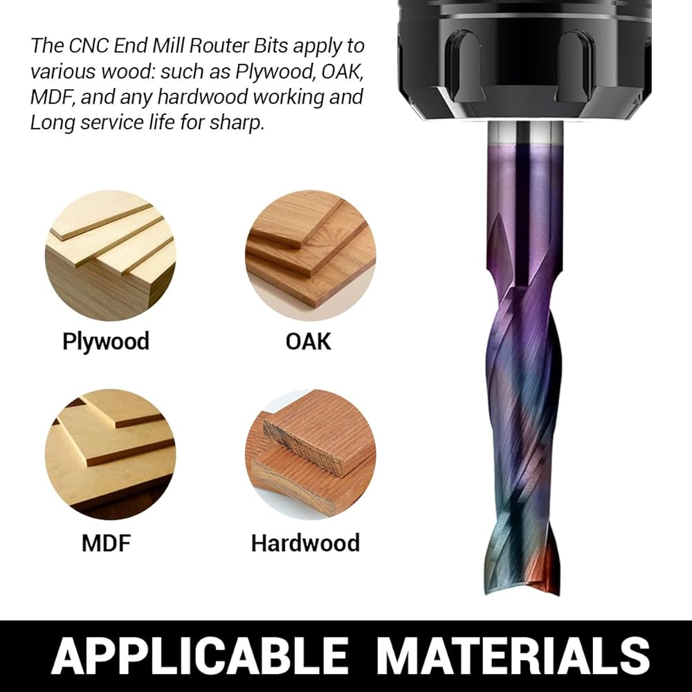 This Sprial Router Bits perfect for soft woods ,hard woods ,plywood,laminate,OAK,MDF and any hardwood working .It can be used with cnc router and handheld router with 1/4‘'collect