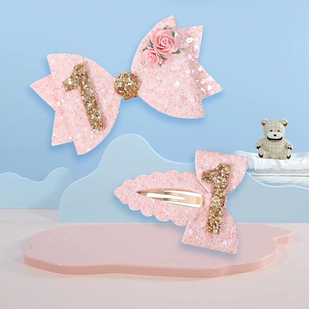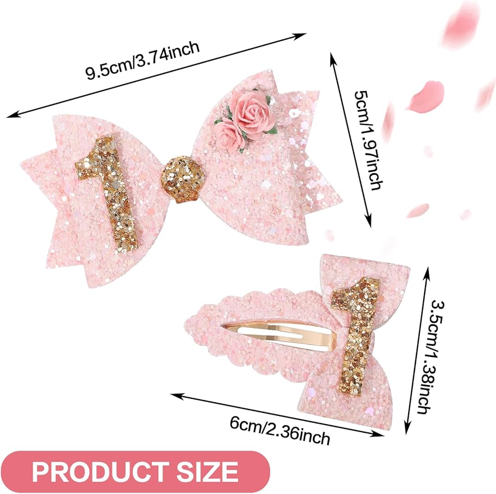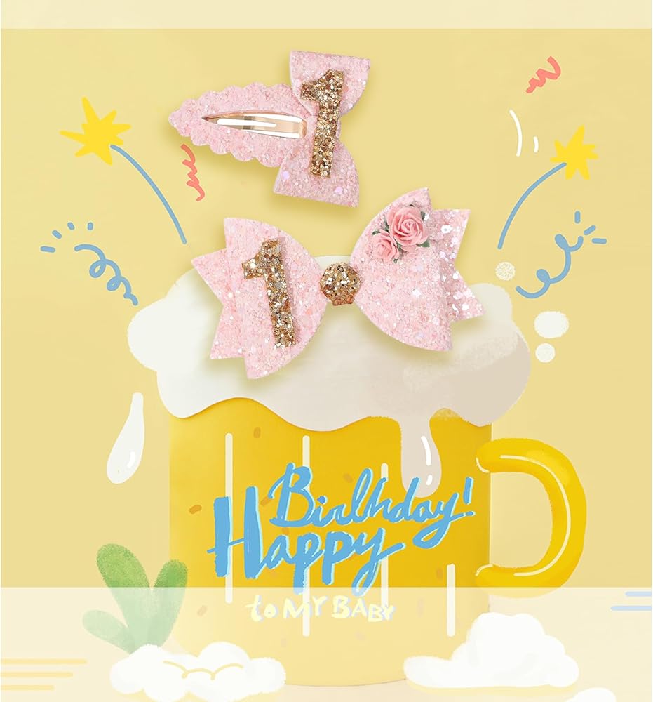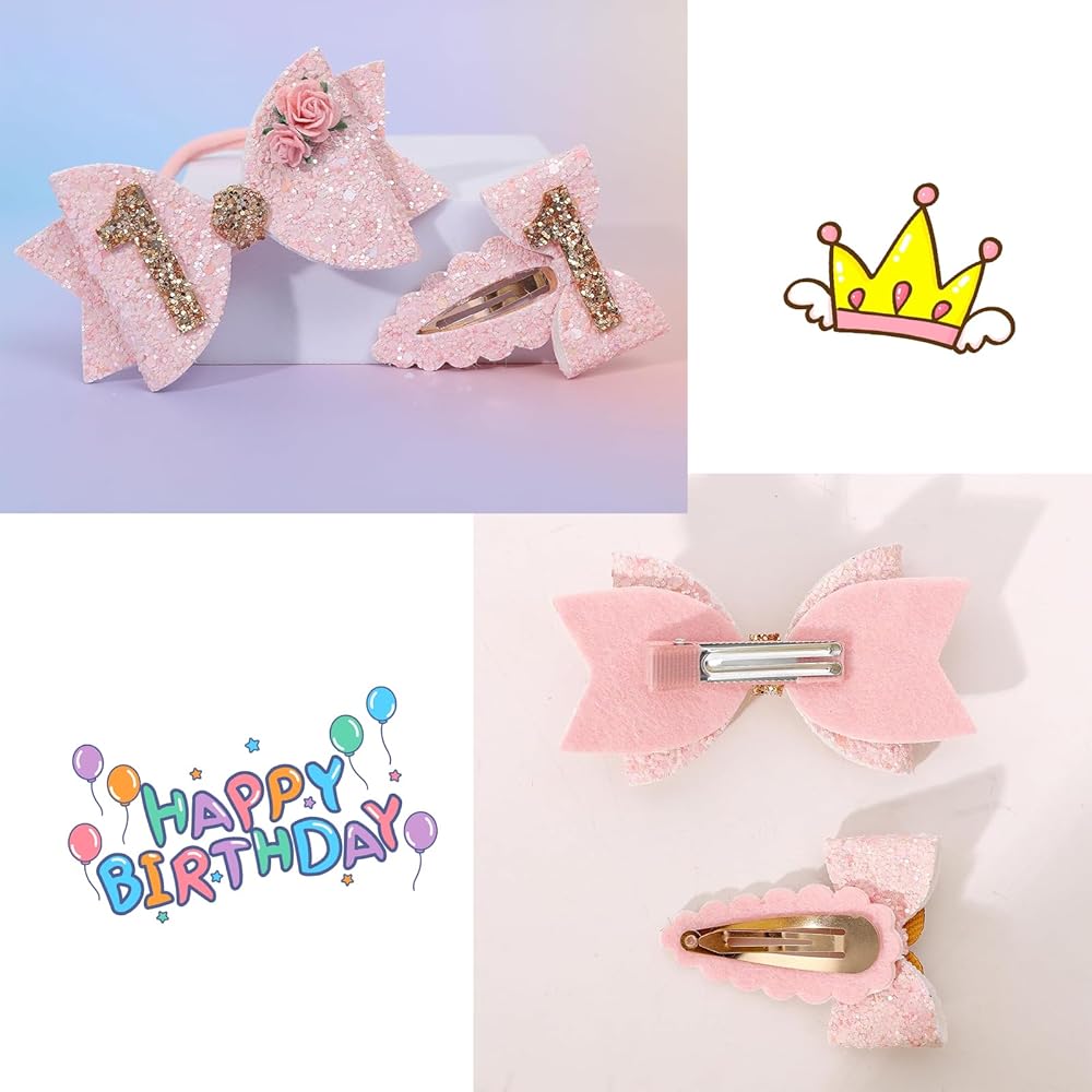 Hair Clips for Baby Girls Hair Bows, 1st Birthday Party Hair Accessories, Glitter Bows and Pink Clips, Cake Crown Girls Hairpin, Birthday Party Boutique Hair Clip