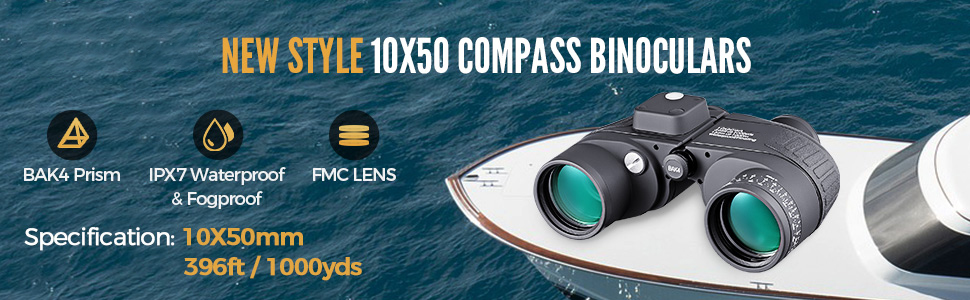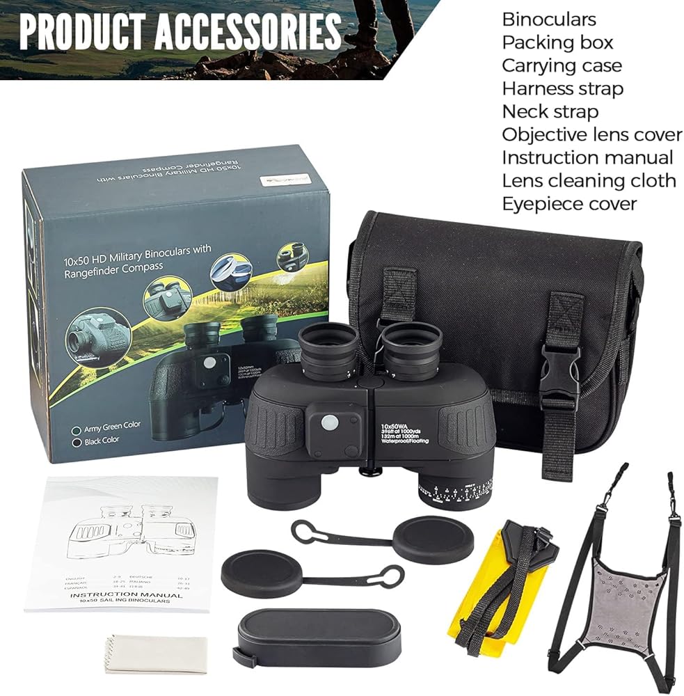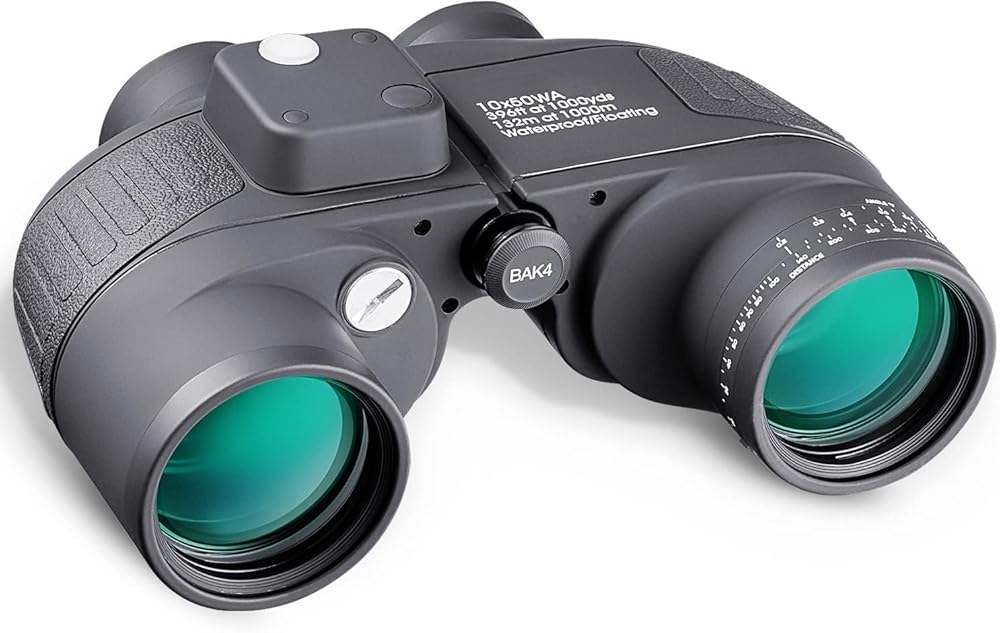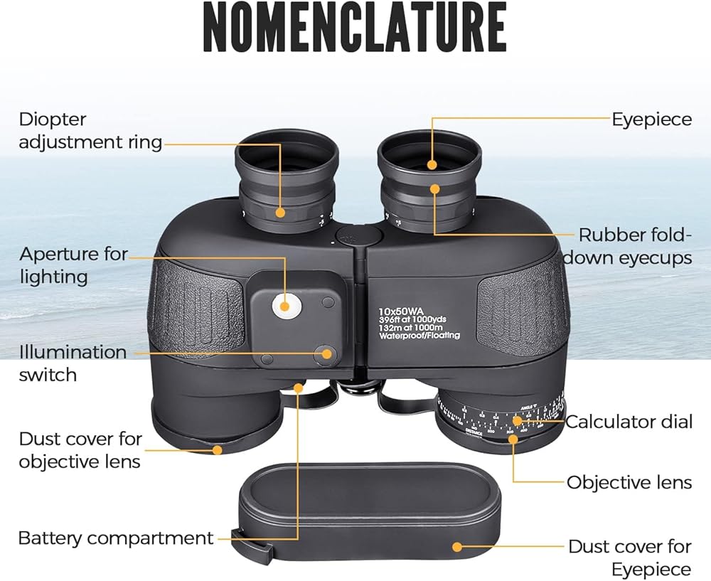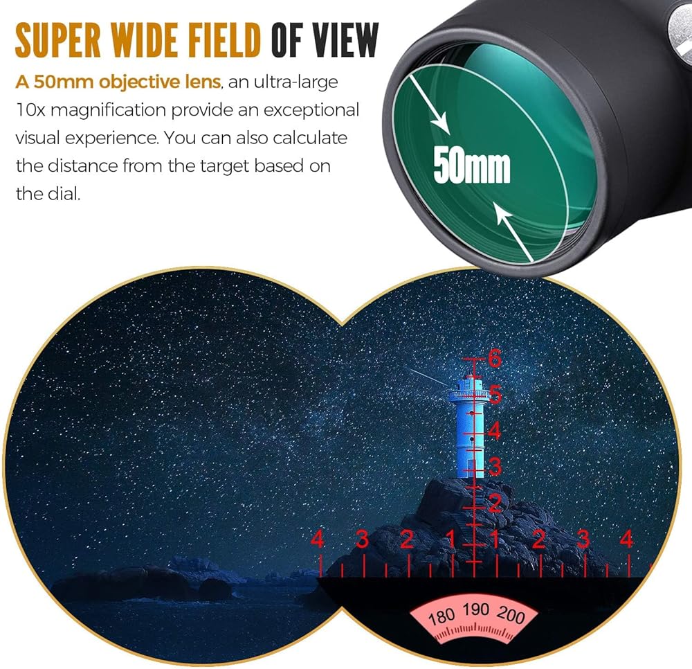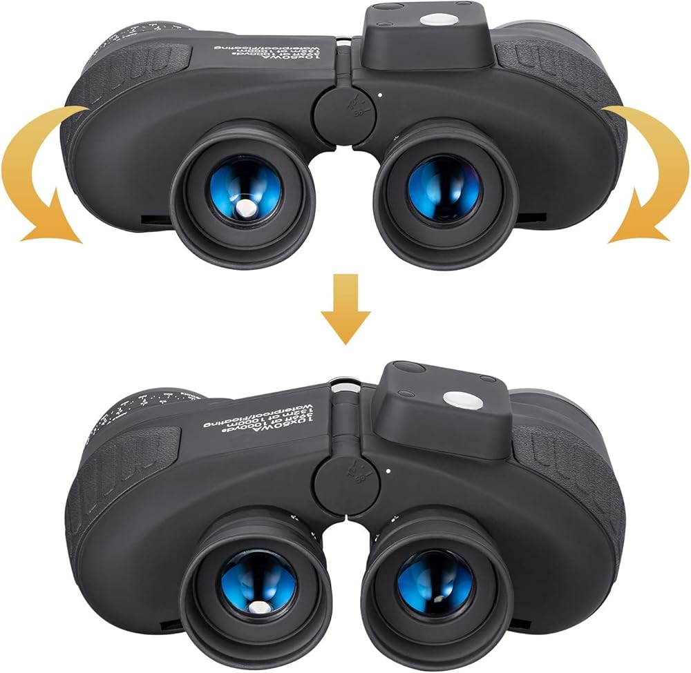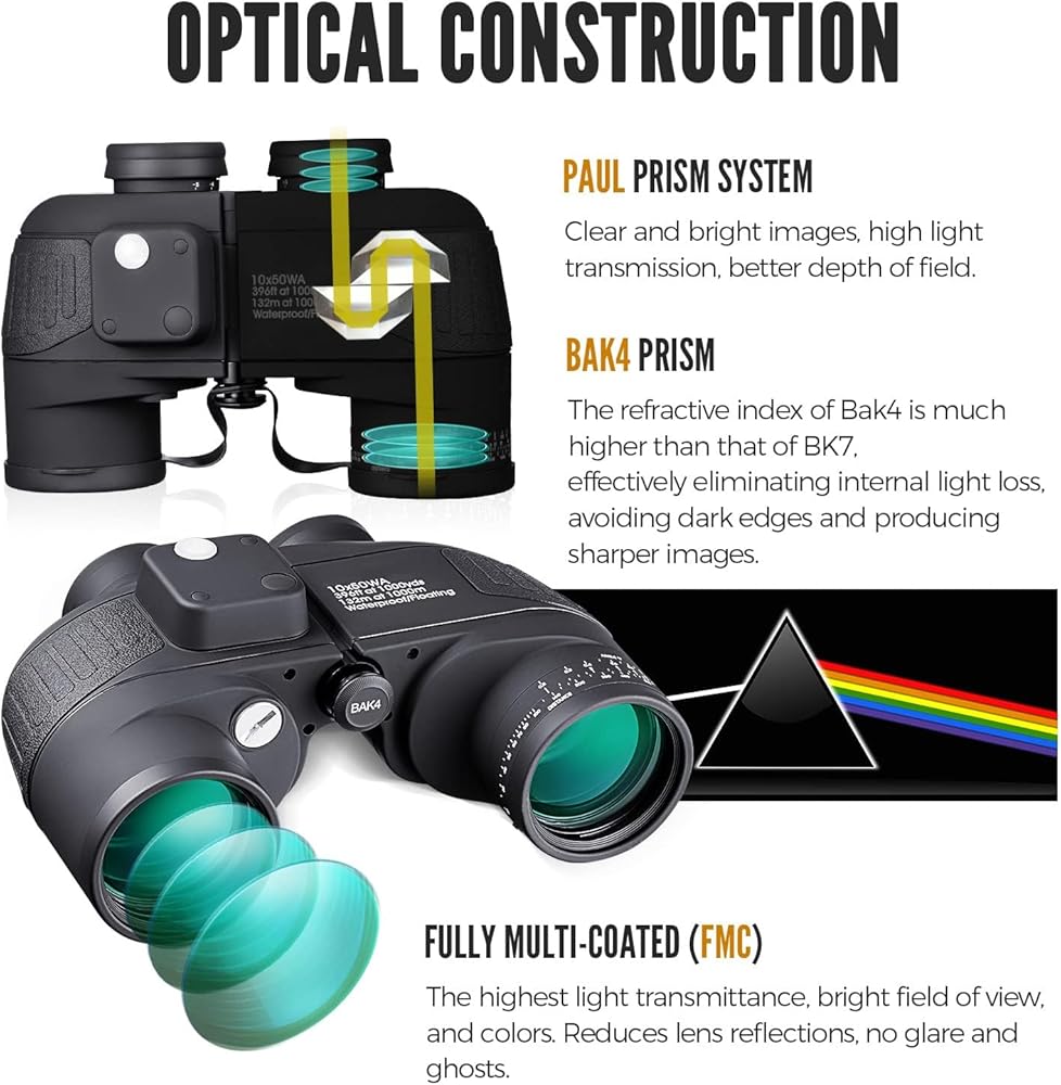 مناظير بحرية 10 × 50 للبالغين، مناظير مقاومة للماء مع بوصلة محدد المدى BAK4 Prism FMC مقاومة للضباب للملاحة والقوارب والصيد الرياضي - جميع الأعمار مع حزام تسخير أسود