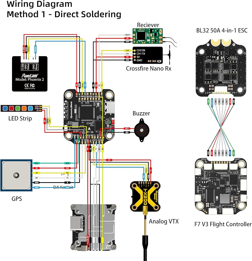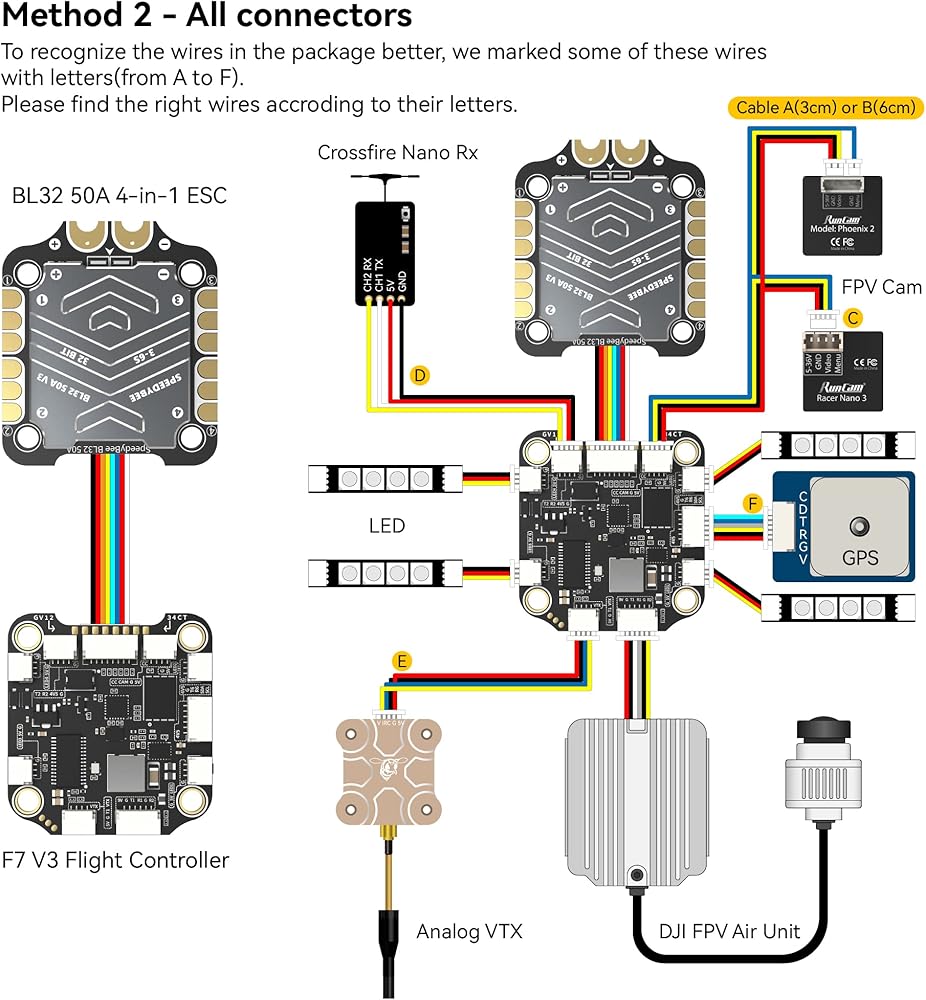 • [تركيب خالٍ من اللحام]: يأتي مع طريقتين للتركيب، جانب واحد يحتوي على منفذ مقابس لجهاز إرسال الفيديو الرقمي، وجهاز الاستقبال، والكاميرا، وVTX، وGPS، ومقابس LED 4x. جانب آخر للحام بنفسك.