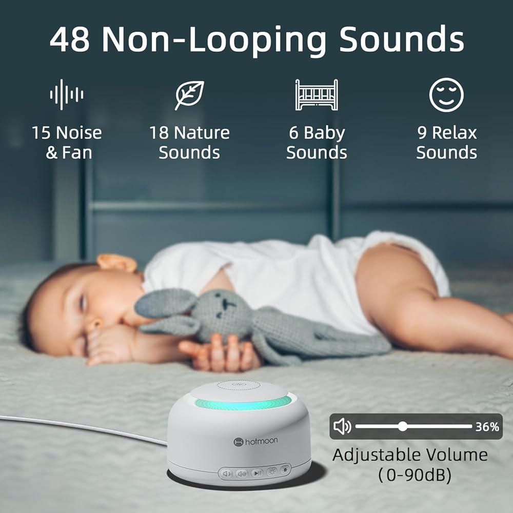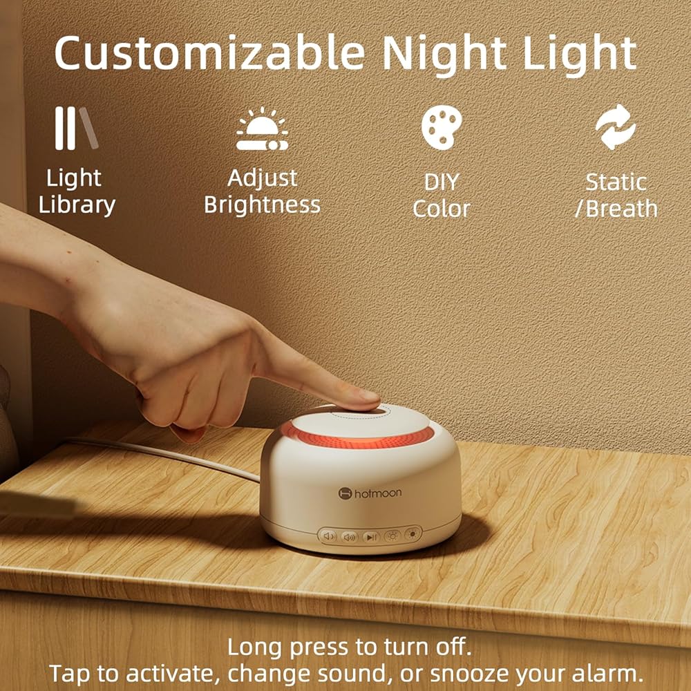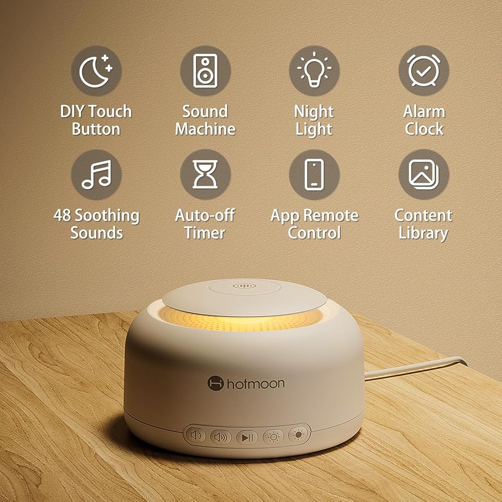 Hotmoon Smart White Noise Sound Machine Sleep Sound Machine، مكبر صوت بلوتوث ثنائي الوضع، 48 صوتًا مهدئًا مدمجًا، ضوضاء بيضاء، أكثر من 300 خيار سحابي، البطاريات غير متضمنة، طاقة التيار المتردد فقط