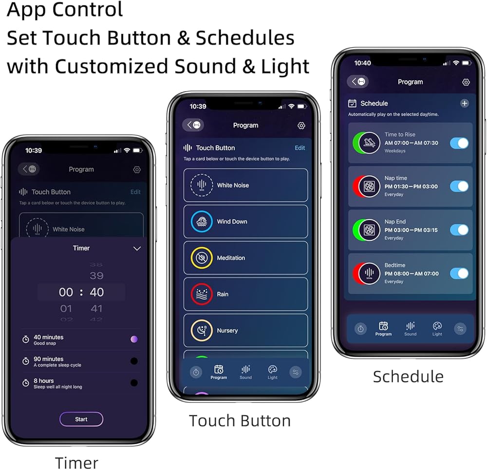 【قائمة تشغيل صوتية قابلة للتخصيص】: قم بتخصيص قائمة التشغيل الخاصة بك بسهولة عن طريق حفظ مفضلاتك من مكتبتنا التي تضم 48 صوتًا وأضواء للنوم مباشرةً على زر اللمس. اضبط تفضيلاتك مرة واحدة واستمتع بنوم هادئ كل يوم دون الحاجة إلى هاتفك المحمول بعد الآن.