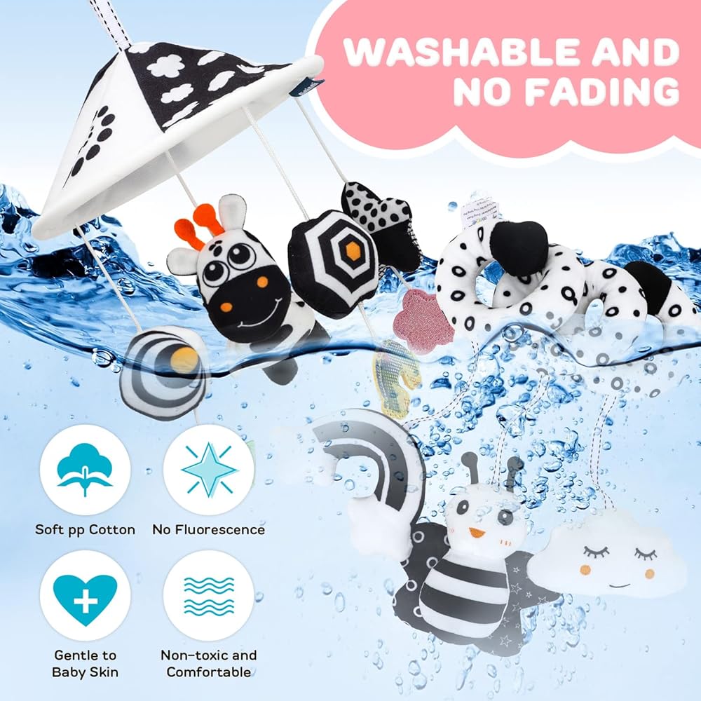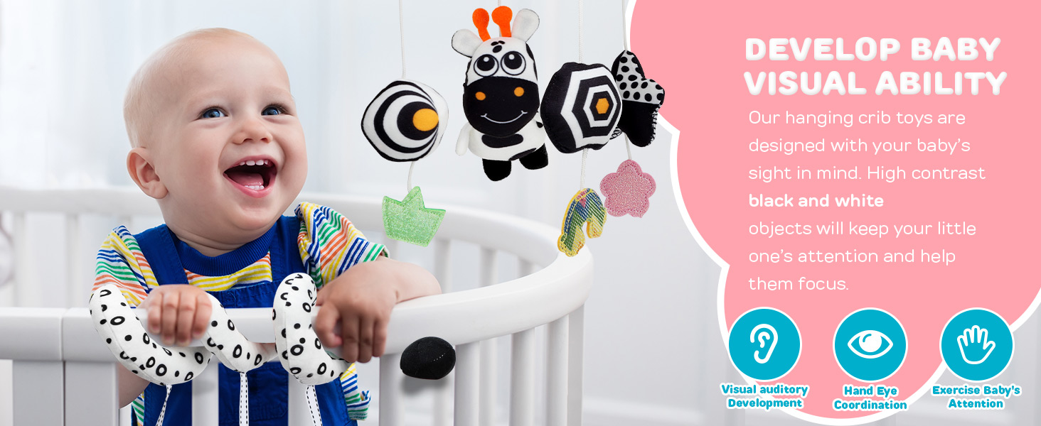 تصميم أبيض وأسود! مصنوعة من قطيفة عالية الجودة وآمنة وناعمة، ألعاب الأطفال المعلقة الخاصة بنا من عمر 0 إلى 6 أشهر مصممة مع وضع رؤية طفلك في الاعتبار. سوف تحافظ الأجسام ذات اللونين الأسود والأبيض عالية التباين على انتباه طفلك وتساعده على التركيز.