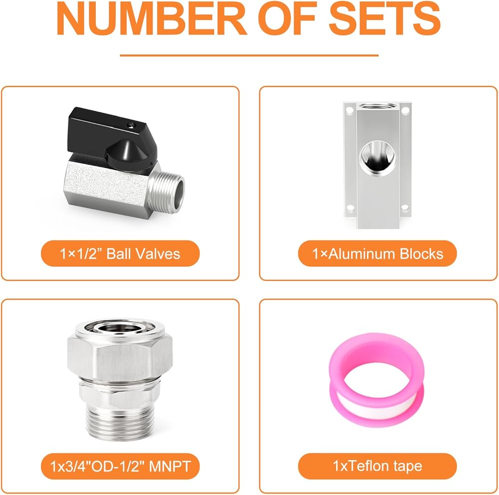 Package Include:1pcsx1/2” Drain Valves,1pcsxAluminum Blocks,1pcsx3/4"OD-1/2" MNPT and 1pcsxTeflon tape