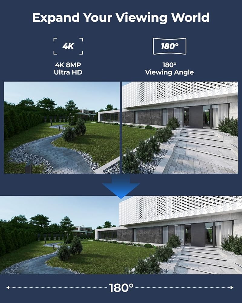 دقة 8 ميجابكسل فائقة الدقة ليلاً ونهارًا: تتيح لك الدقة العالية بدقة 8 ميجابكسل رؤية كل التفاصيل بوضوح. تتيح لك الرؤية الليلية بالأشعة تحت الحمراء لمسافة طويلة 30 مترًا والرؤية الليلية الملونة التي يتم تمكينها بواسطة الأضواء الكاشفة التقاط أي حركات مشبوهة حتى في الظلام.