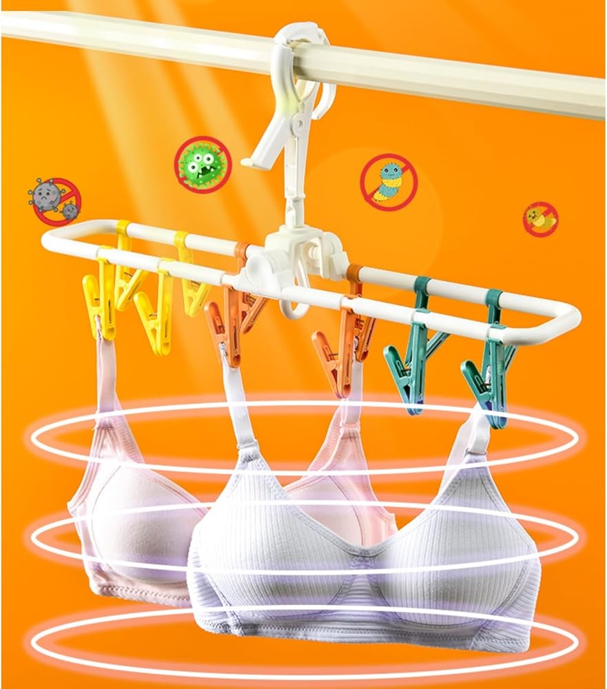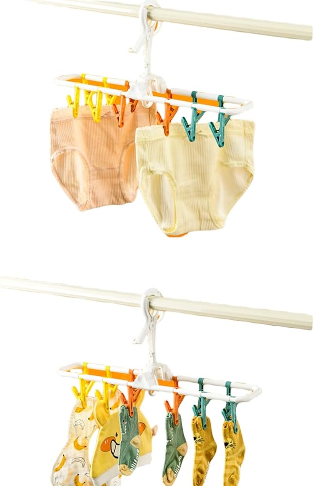 رفوف تجفيف الملابس، 2 حزمة من شماعات الملابس الداخلية القابلة للطي والمحمولة والقابلة للقفل مع 24 مشبكًا من الجوارب، خطاف مقاوم للرياح قابل للدوران 360 درجة لتجفيف المناشف وحمالات الصدر وقفازات الملابس البلاستيكية البيضاء