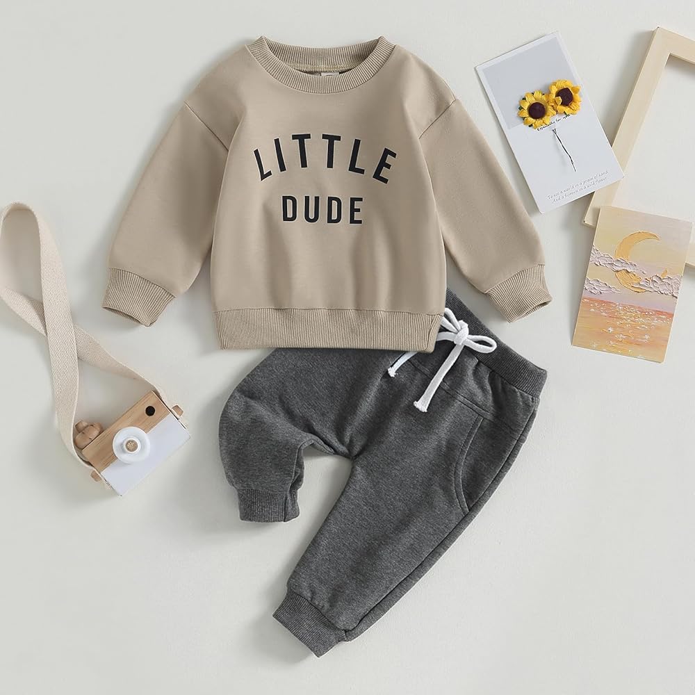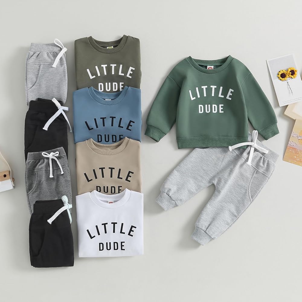 التصميم: مجموعة سويت شيرت للأطفال الصغار مكونة من قطعتين: طباعة حروف، رقبة دائرية، أكمام طويلة، سويت شيرت للرضع، سراويل رياضية للأولاد مع جيوب، خصر مرن وتصميم برباط، مثالي لملابس الربيع والخريف والشتاء، بسيط جدًا ولكنه رائع، يحافظ على أطفال دافئون ومريحون مع كونهم أنيقين.