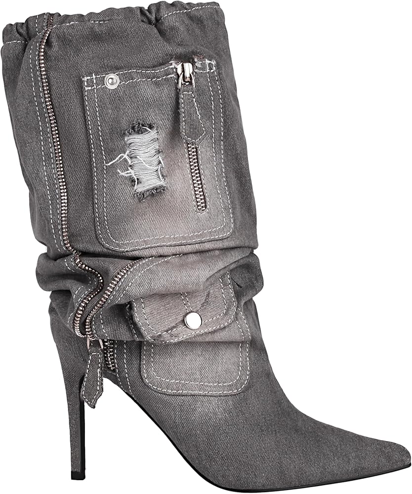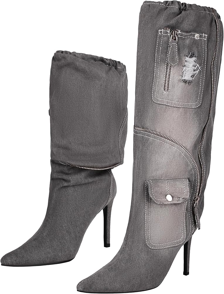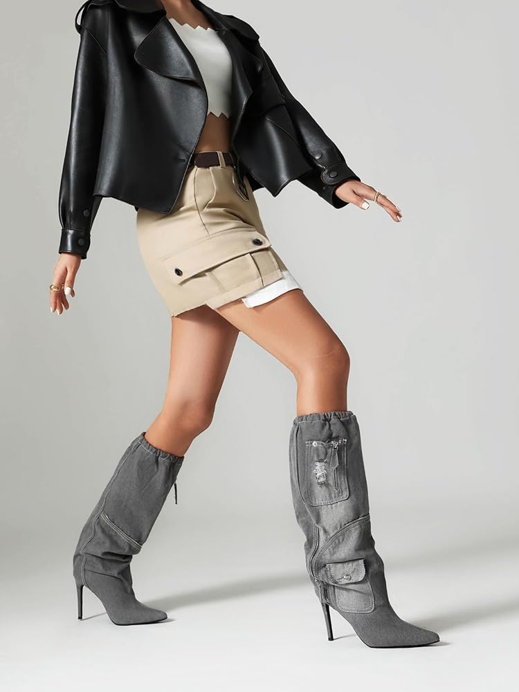 👢【المميزات】: حذاء طويل حتى الركبة من الدنيم مع سحاب وجيوب مزخرفة، ومقدمة مدببة أنيقة وكعب ستيليتو. ارتديه مع حذاء بكعب عالٍ حتى الركبة لمظهر مستوحى من أسلوب البانك.