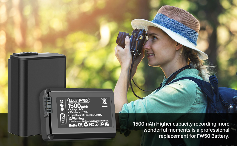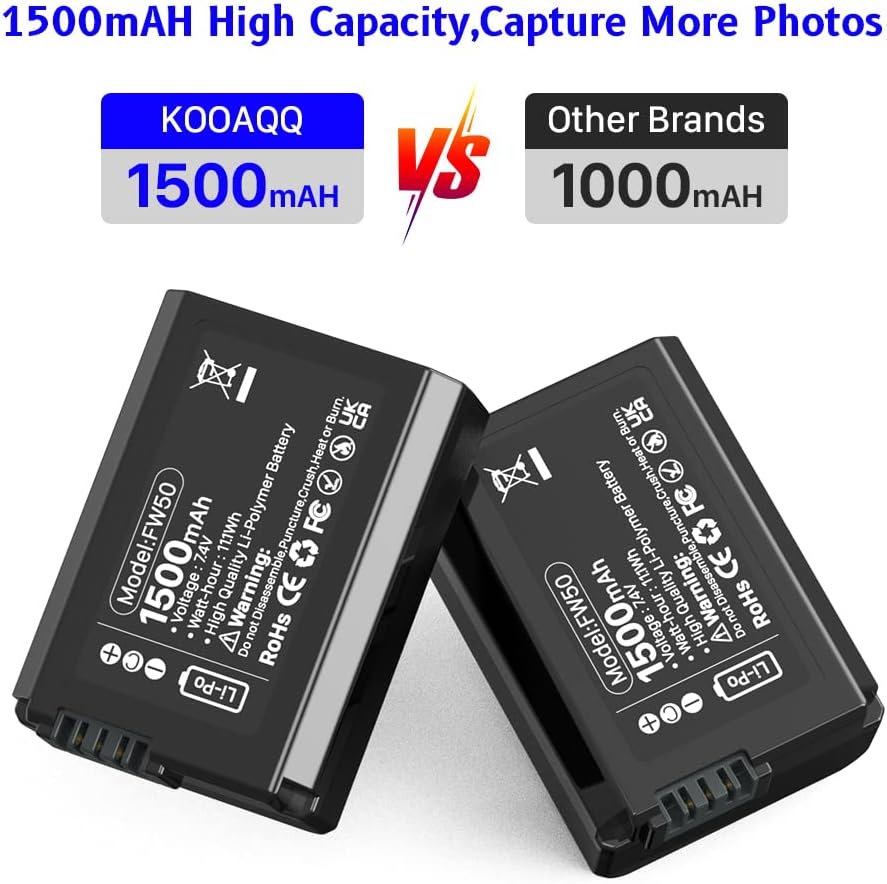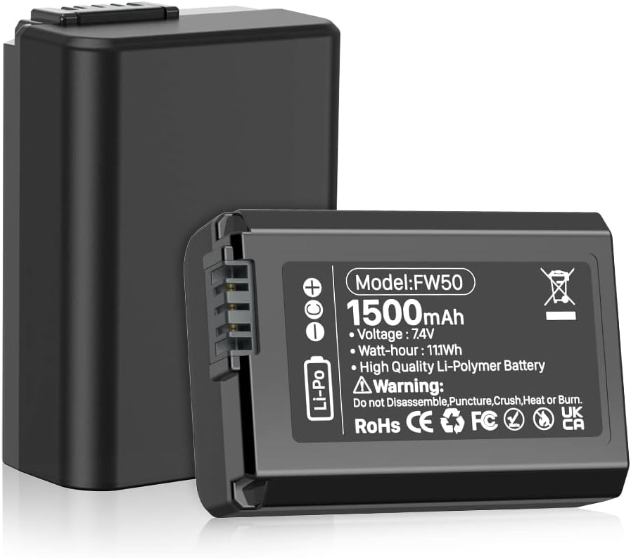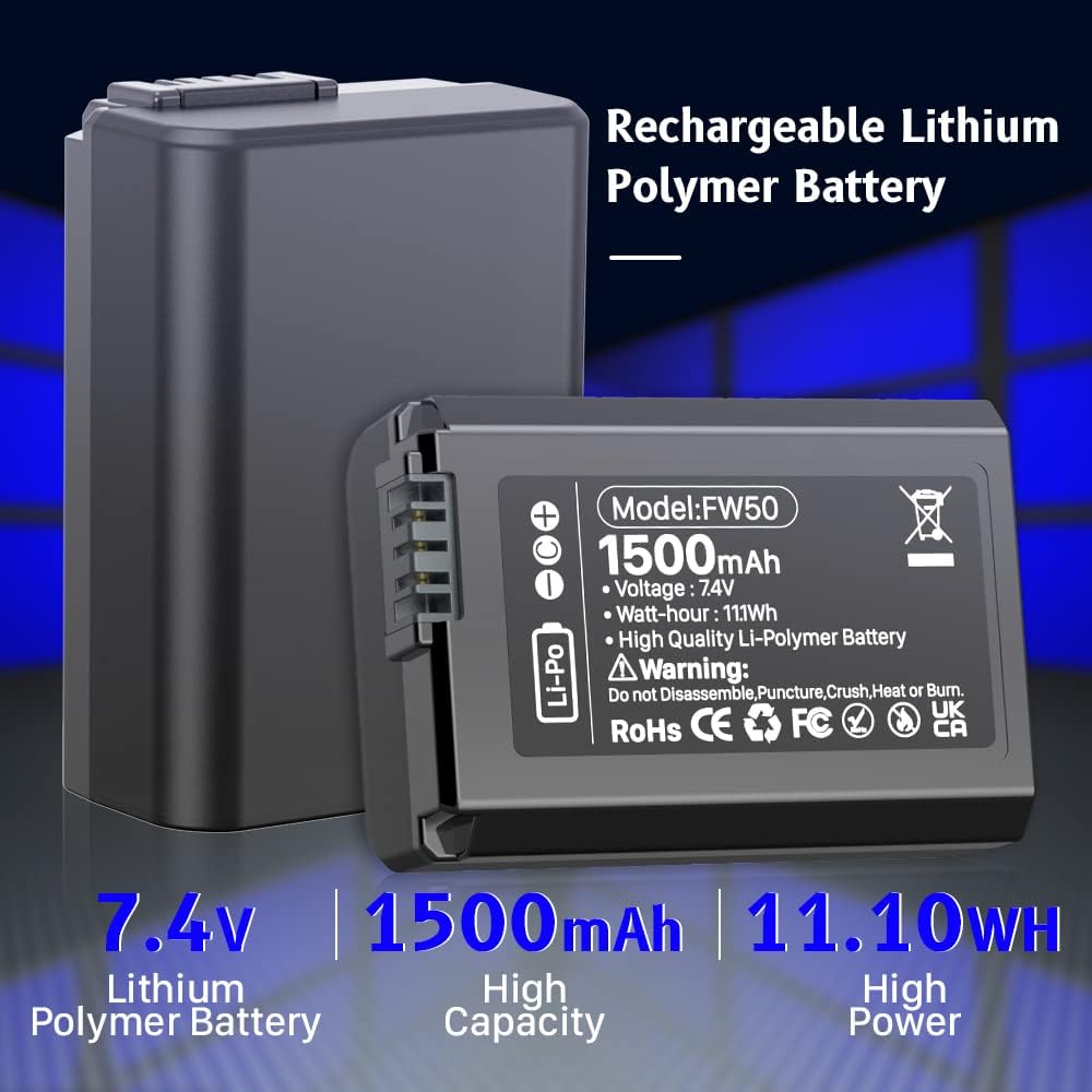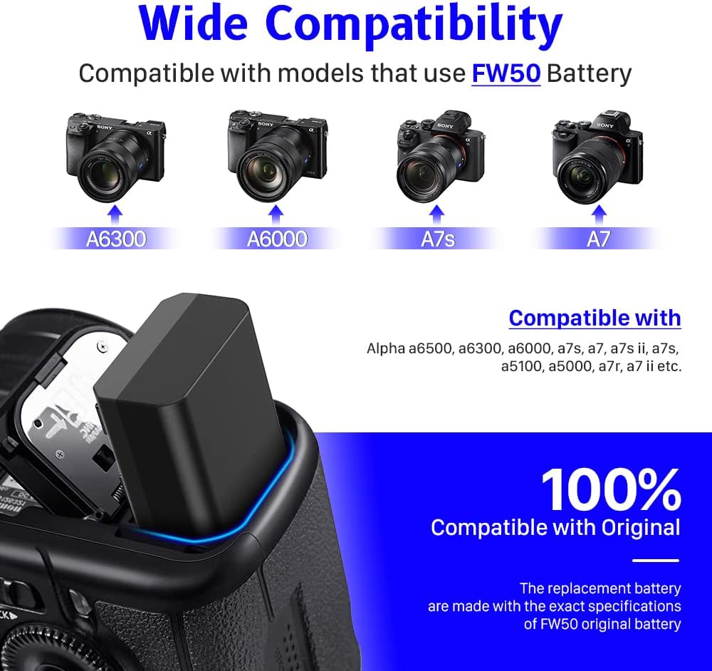 【متوافقة تمامًا】: بطارية NP-FW50 لكاميرات Sony ZV-E10، A6000، A6500، A6300، A6400، A7، A7 II، A7R II، A7S II، A7S، A7R، RX10-3818 وغيرها من الكاميرات الرقمية.
