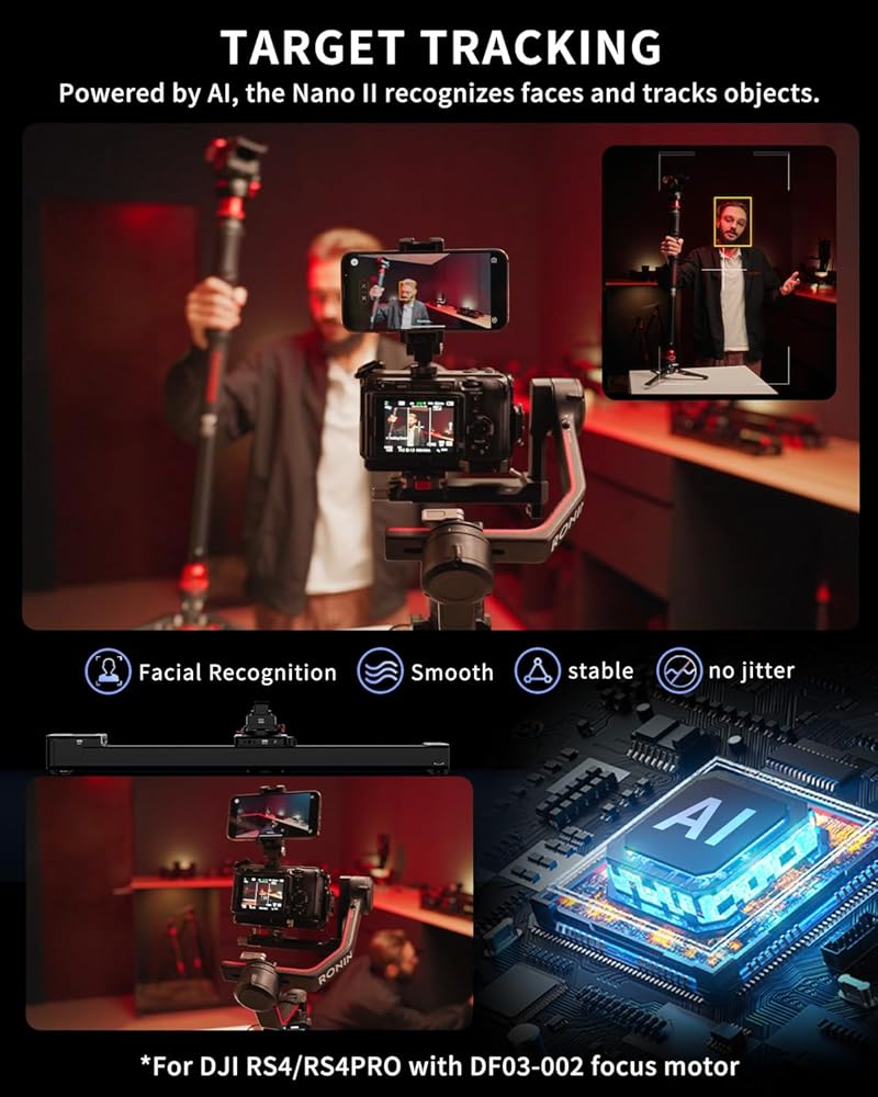 • [التعرف على الوجه] يوفر شريط تمرير الكاميرا Nano 2 تتبعًا أفقيًا ثنائي المحور، وعندما يقترن بمثبتات DJI، فإنه يتيح تتبعًا ذكيًا كاملاً بخمسة محاور - التحريك والإمالة واللف - للحصول على لقطات سلسة وثابتة.