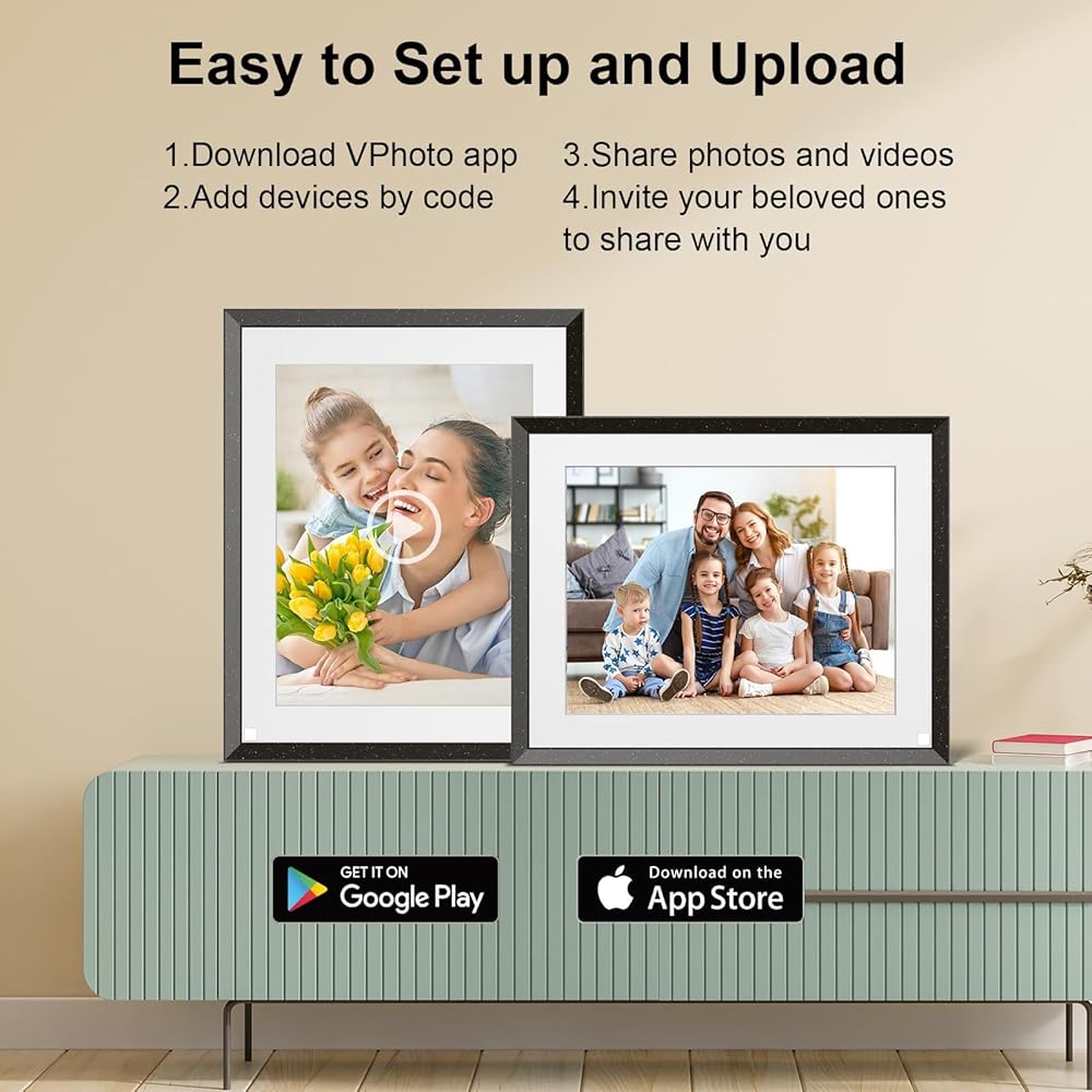 【Sharing Photos and Videos Anywhere in the World】: Connect the 9.7 inch digital photo frame to WiFi, sharing the wonderful moments and meaningful videos via free "VPhoto App" anytime anywhere. The large digital picture frame let your families and friends enjoy your wonderful moments within seconds and make your family full of heart-warming surprises.