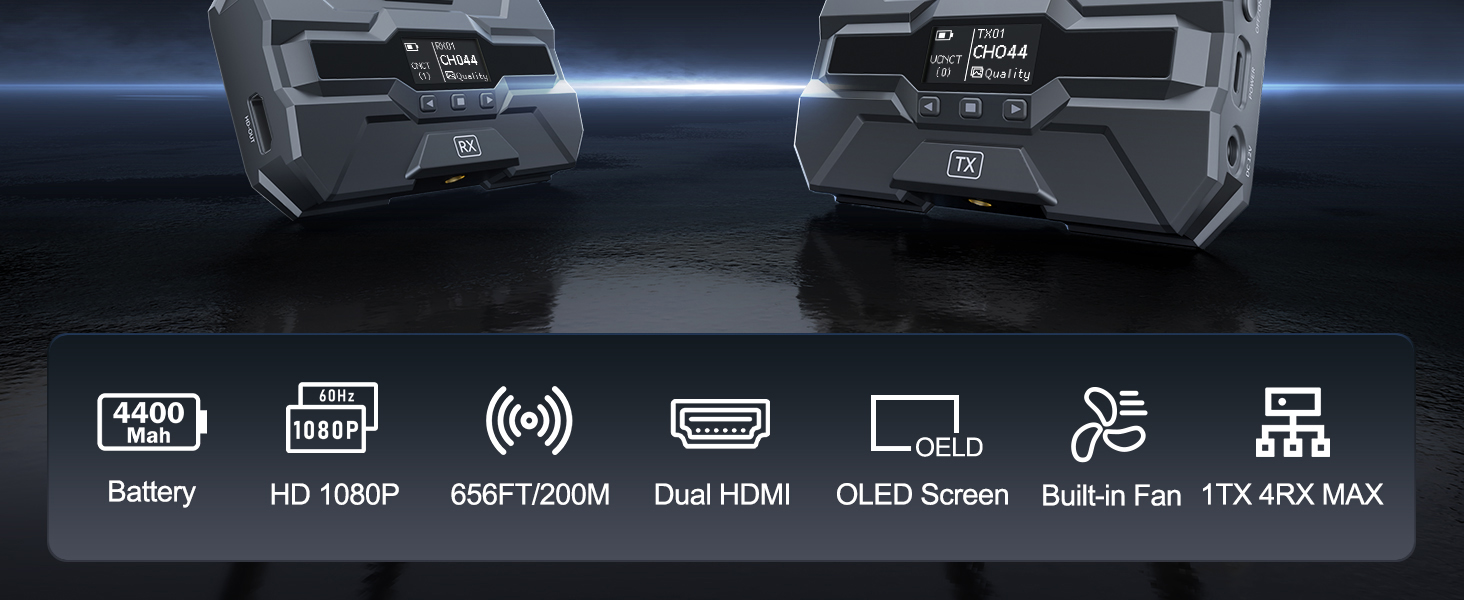 بطارية عالية السعة وشاشة OLED: تم تجهيز جهاز إرسال الفيديو اللاسلكي R200 ببطاريتين بقدرة 4400 مللي أمبير للاستخدام الممتد. ويتميز بحذاء بارد مخصص للتثبيت المستقر والمريح، وشاشة OLED لعرض حالة الجهاز