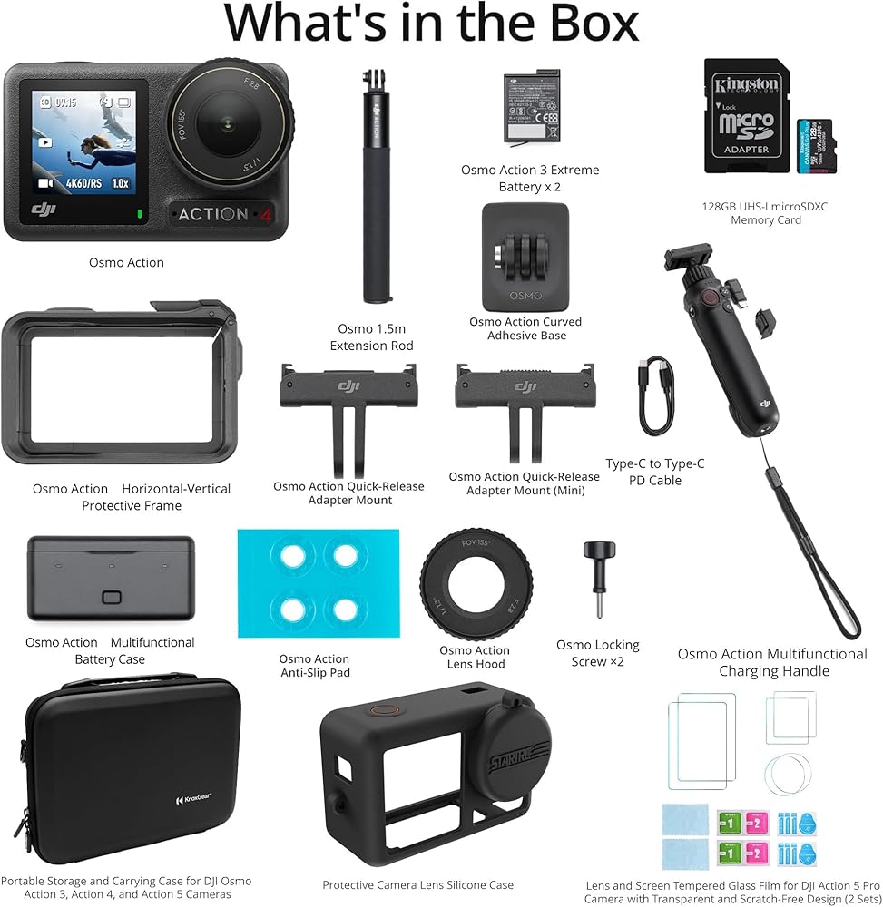 Bundle Includes: DJI Osmo Action 4 Camera Adventure Combo with Osmo Action Multifunctional Charging Handle, Portable Storage and Carrying Case, 128GB MicroSDXC Card Lens, Tempered Glass Film (2 Sets) and Protective Camera Silicone Case