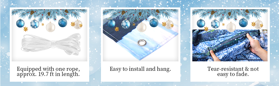سهلة التركيب: توجد 4 فتحات نحاسية في زوايا زينة خلفية ندفة الثلج لعيد الميلاد، مجهزة بقطعة واحدة من الحبل تقريبًا. 19.7 قدم في الطول؛ يمكنك استخدام الحبل لتثبيت نسيج الخلفية على الحائط، والشرفة، وباب المرآب، وخلف شجرة الكريسماس والعديد من الأماكن الأخرى التي تريدها؛ إنها كبيرة ومريحة بما يكفي لتلبية متطلباتك المتنوعة