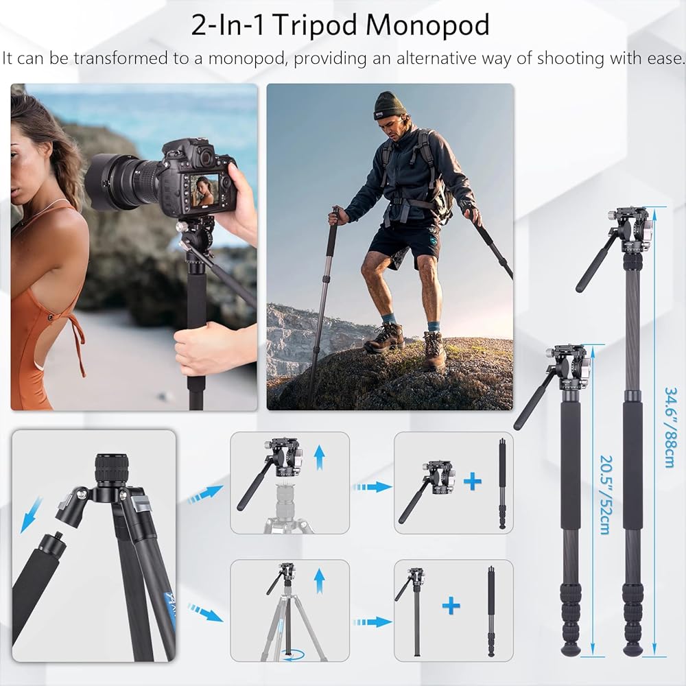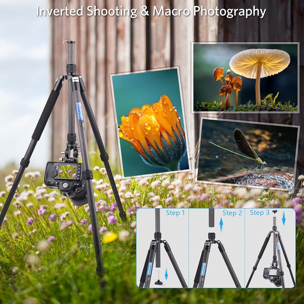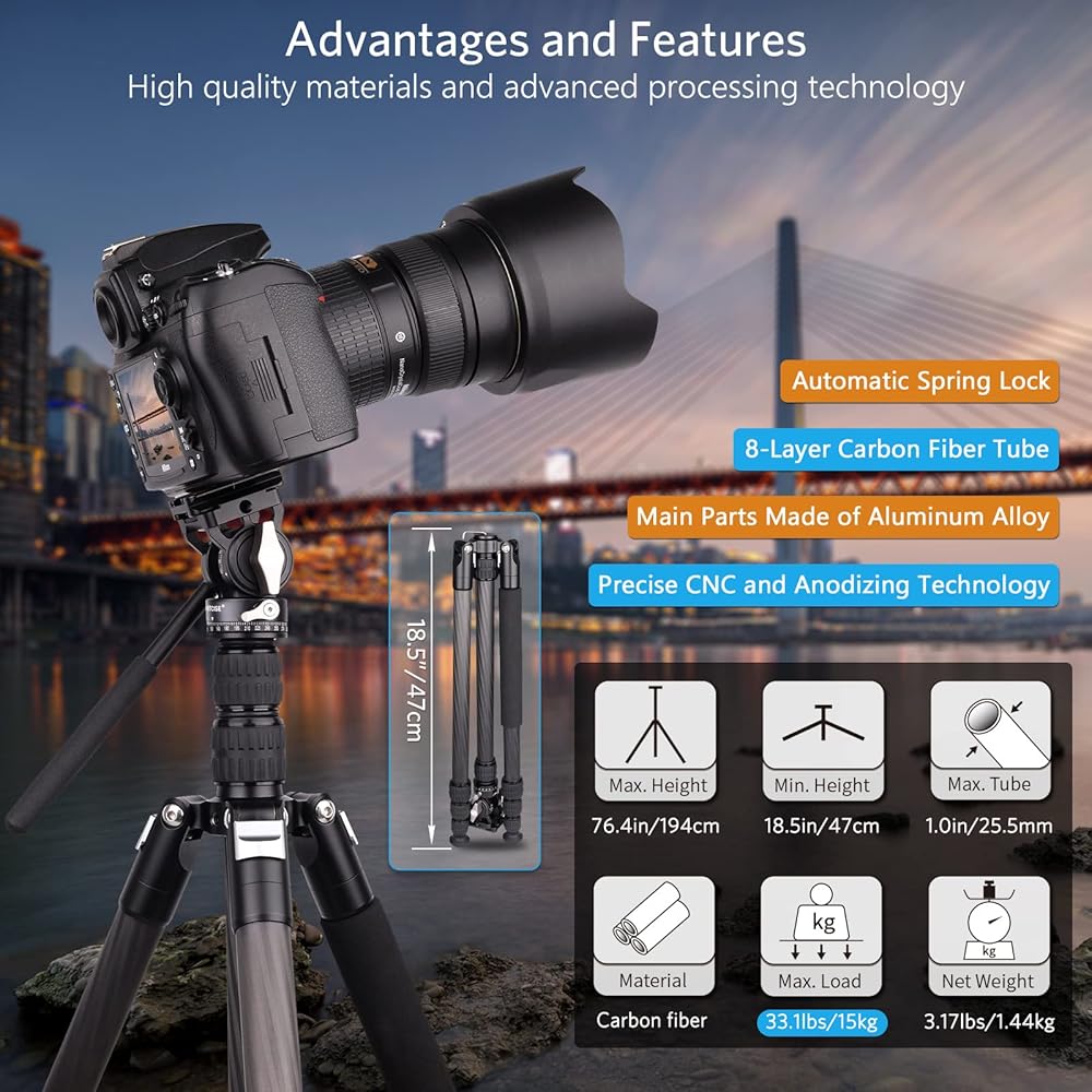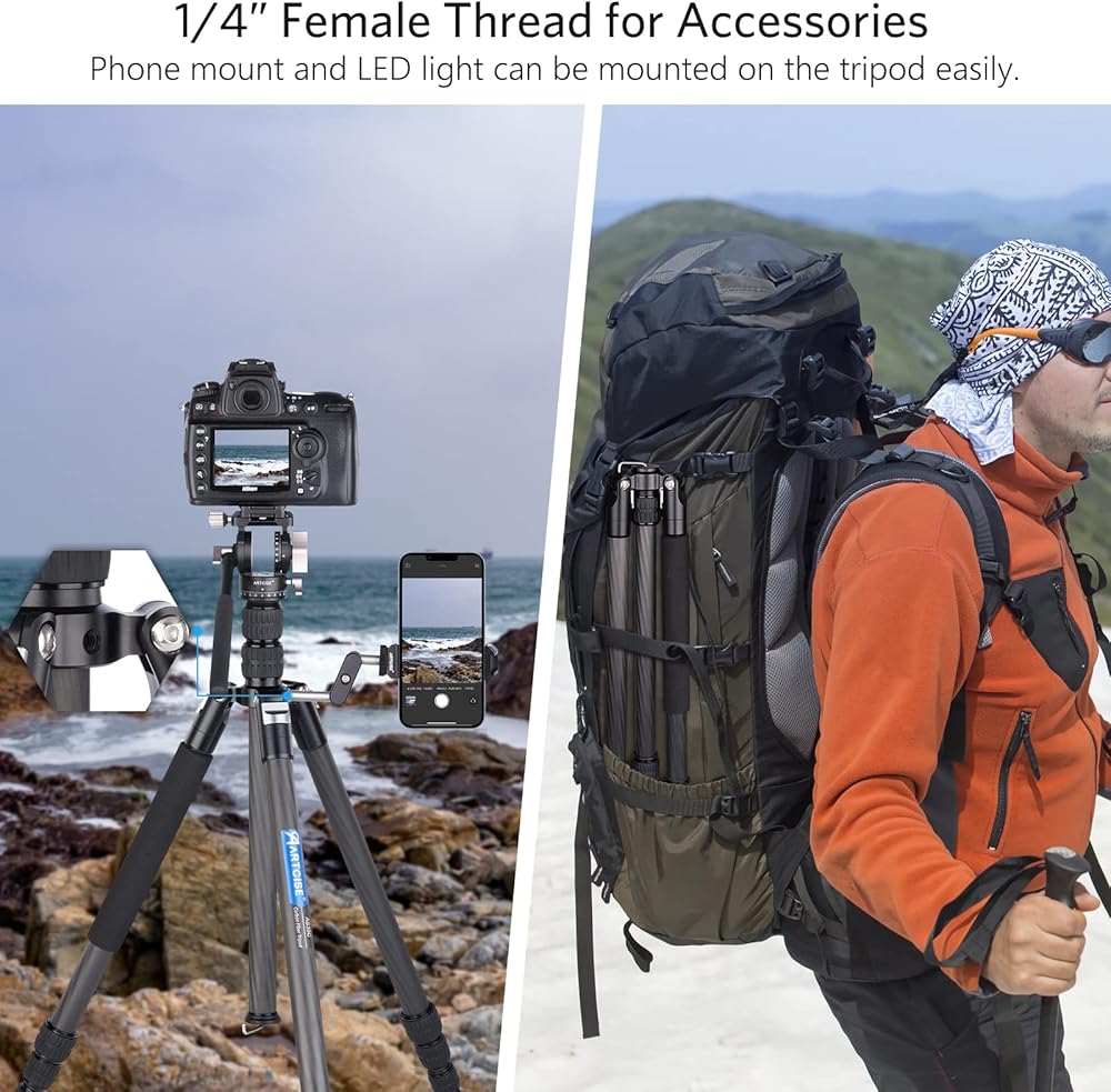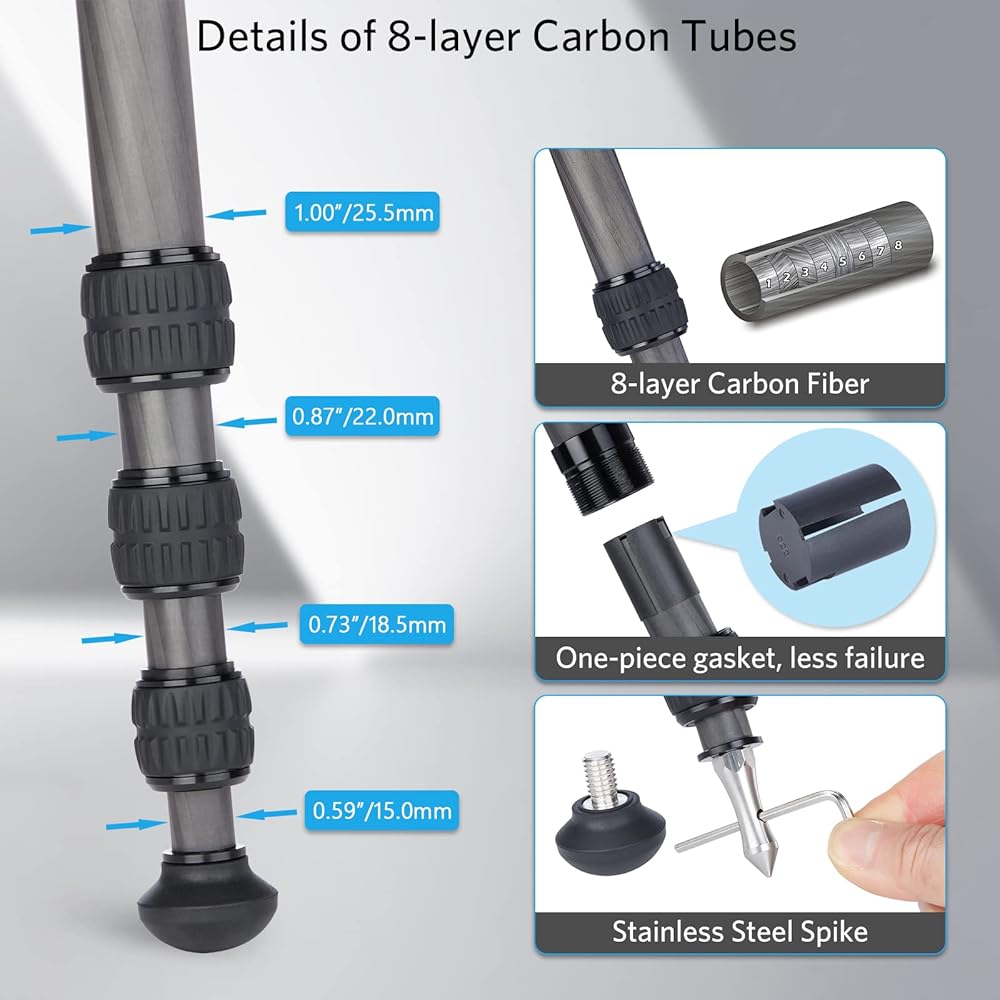 【More Stable and Lightweight Carbon Fiber Tripod】: All 12 leg tubes and 2-Section center column tubes are made of thick real 8-layer carbon tubes! Carbon fiber is imported from Japan and hardened by high-temperature treatment to be more solid and stable. The main connecting parts are manufactured by CNC machining and polishing and then anodized, not only the structure is more stable, but also looks and feels better. Weight only 3.17 lbs/1.44kg, the latest design of the accessory hole will be a masterstroke.