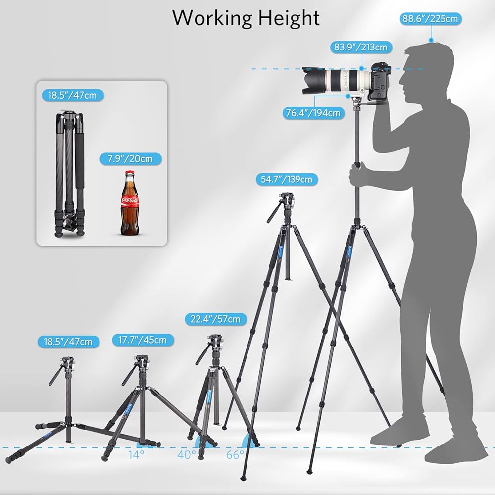 【Tall Portable 2Way Video Head Camera Tripod】: Inverted storage makes it more compact and portable, Max using height is 76.4inch/194cm but storage length of only 18.5inch/47cm, equipped with a mini video tripod head (with extra arca quick release plate), the two-section center column with the gravity hook is the standard design, but the accessory hole and the gift of magic hand and phone clip idea is unique to us.