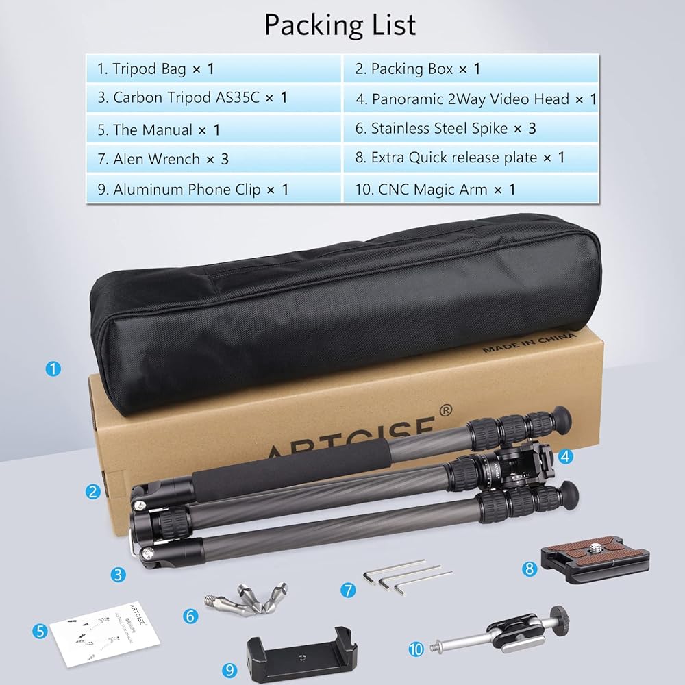 Isn't the tripod you are looking for? PACKING LIST: Carbon Fiber Tripod AS35C+ Mini Video Tripod Head+ Extra Quick Release Plate+ CNC Magic Arm+ CNC Phone Holder+ Instruction Manual+ Stainless Steel Leg Spikes, The 1/4" screw quick release plate is suitable for most cameras, DSLR, SLR, sports camera, projector, and telescope, etc.