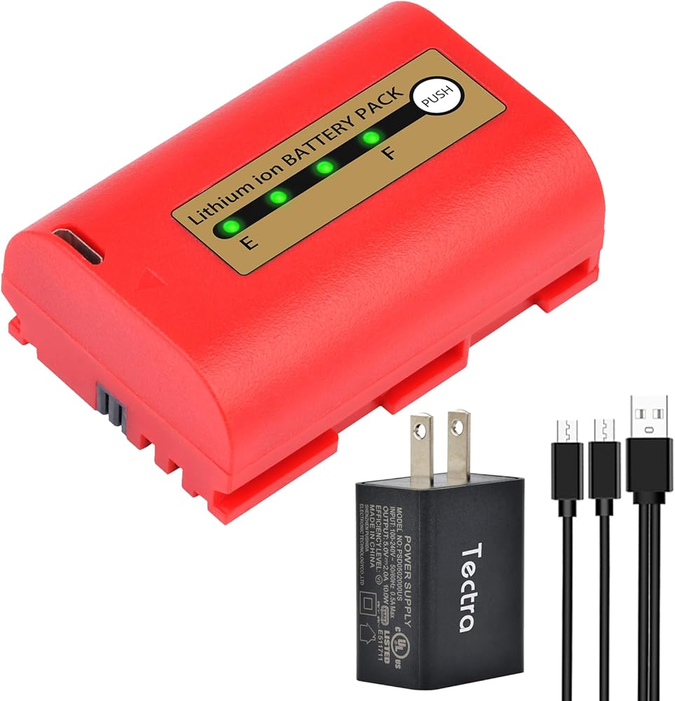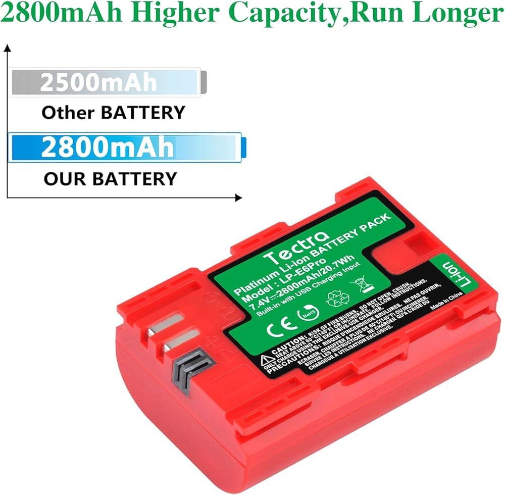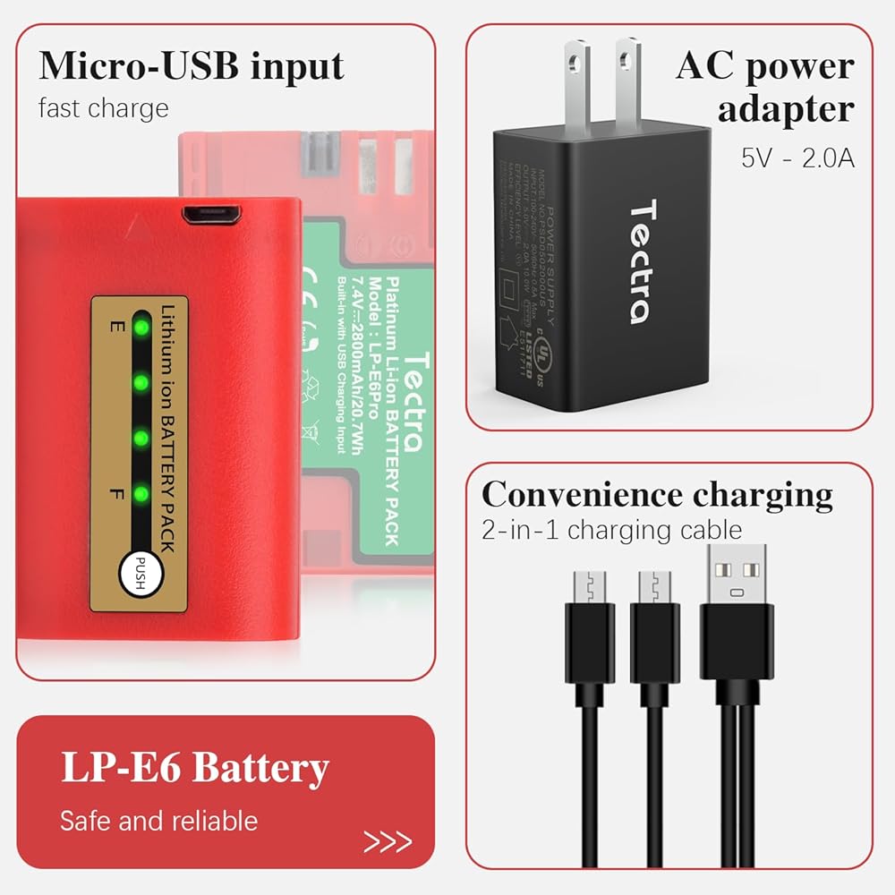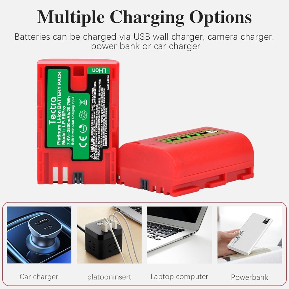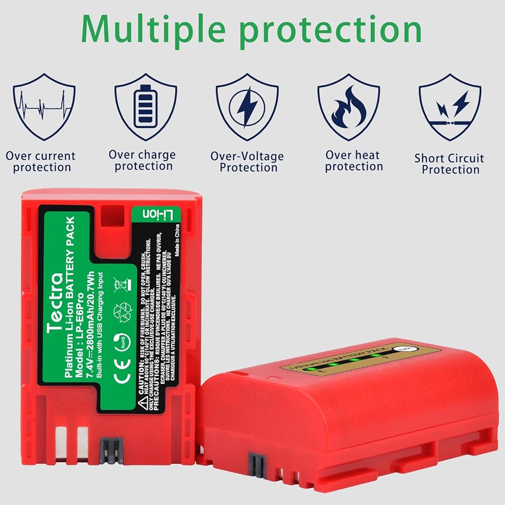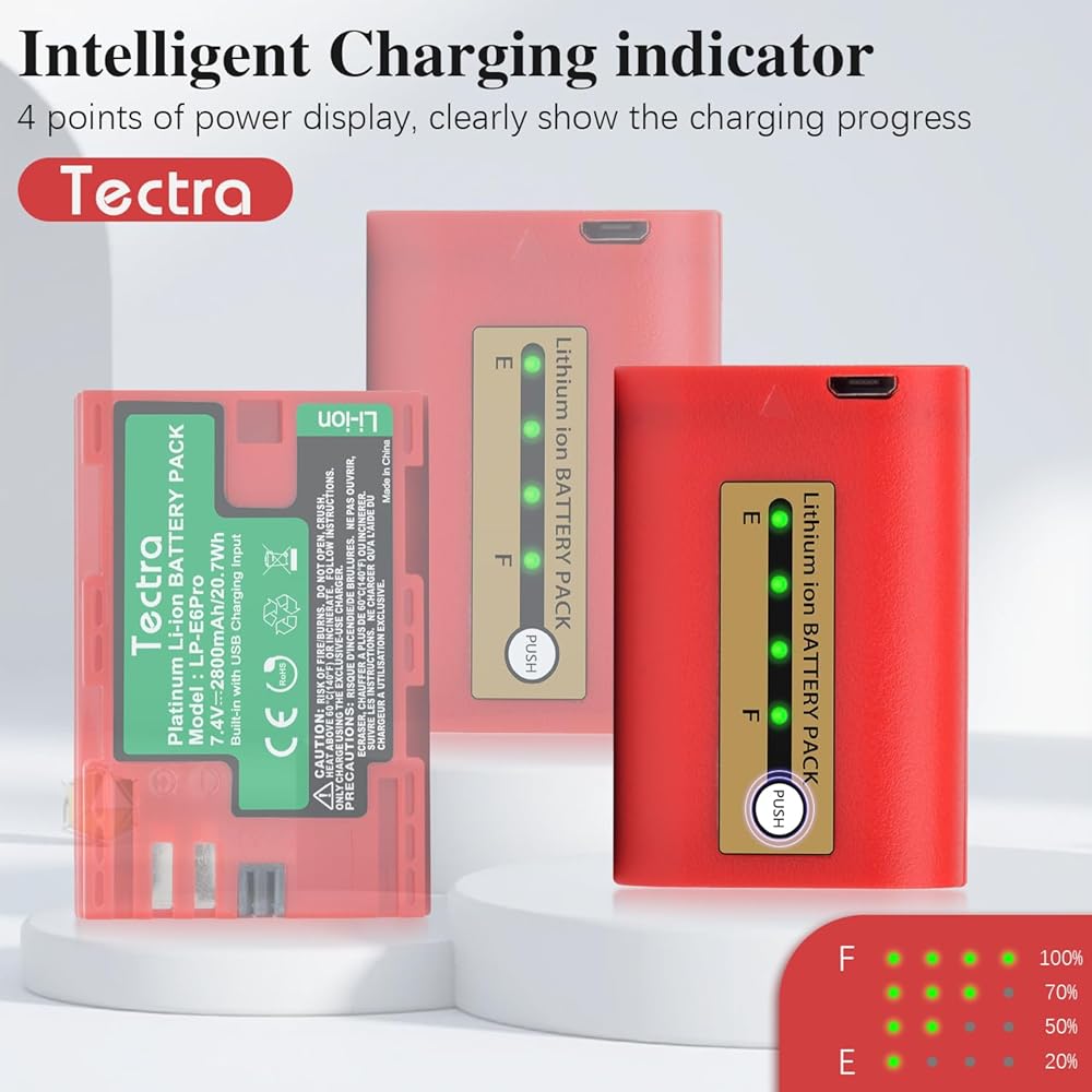 بطارية Tectra LP-E6 LP-E6N متوافقة مع Canon EOS R, R5, R6, 5D Mark II III IV, 5Ds, 5DS R, 6D, 7D, 7D Mark II, 60D, 70D, 80D,90D, C700, XC15 مع شاحن تعيين