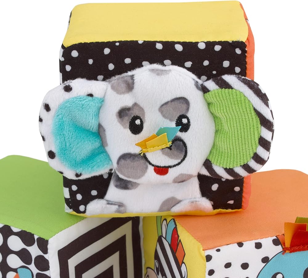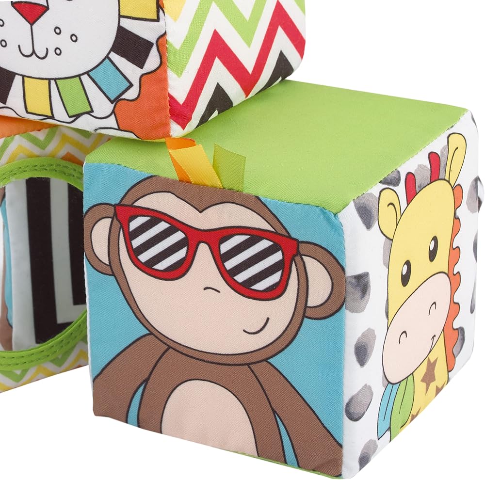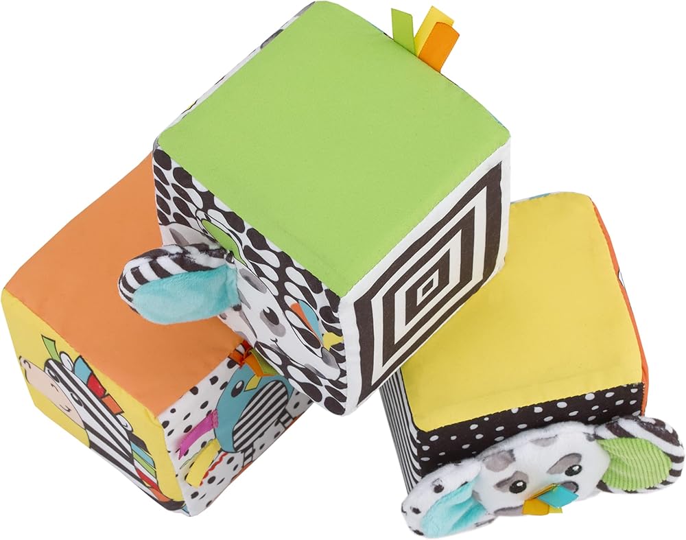 Perfect for baby's first blocks! Sassy Baby Eli Elephant Multi-Colored Developmental Plush Baby Blocks come in a set of three. The bright contrasting colors stimulate baby's senses. Features elephant, monkey, zebra and giraffe in black and white stripes and dots with accents in yellow, orange, blue and green. Each block has it's own sound, crinkle, rattle and chime with mirror to hold baby's attention. The chunky size makes it easy for little hands to stack, toss, grasp and build, strengthening fine motor skills. Helps develop early STEM learning. Keep baby busy with these fun plush blocks! Each block measures 3.5" x 3.5". Makes a wonderful gift!