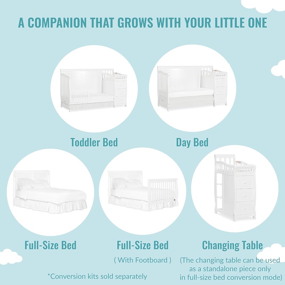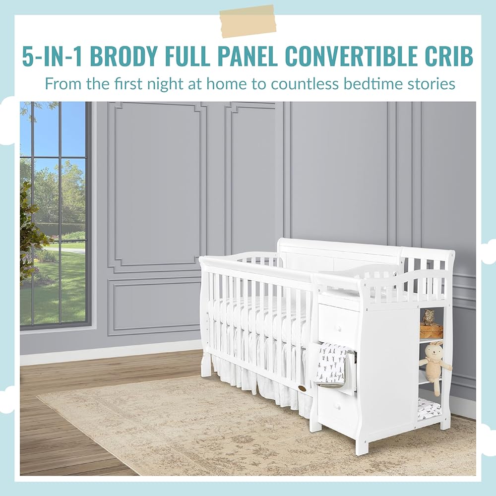 TRANSITIONS WITH YOUR BABY: The Brody 5-in-1 Full Panel Convertible Crib & Changer easily converts from a crib to a Daybed, Toddler bed, and Full-size Bed (conversion kit sold separately).